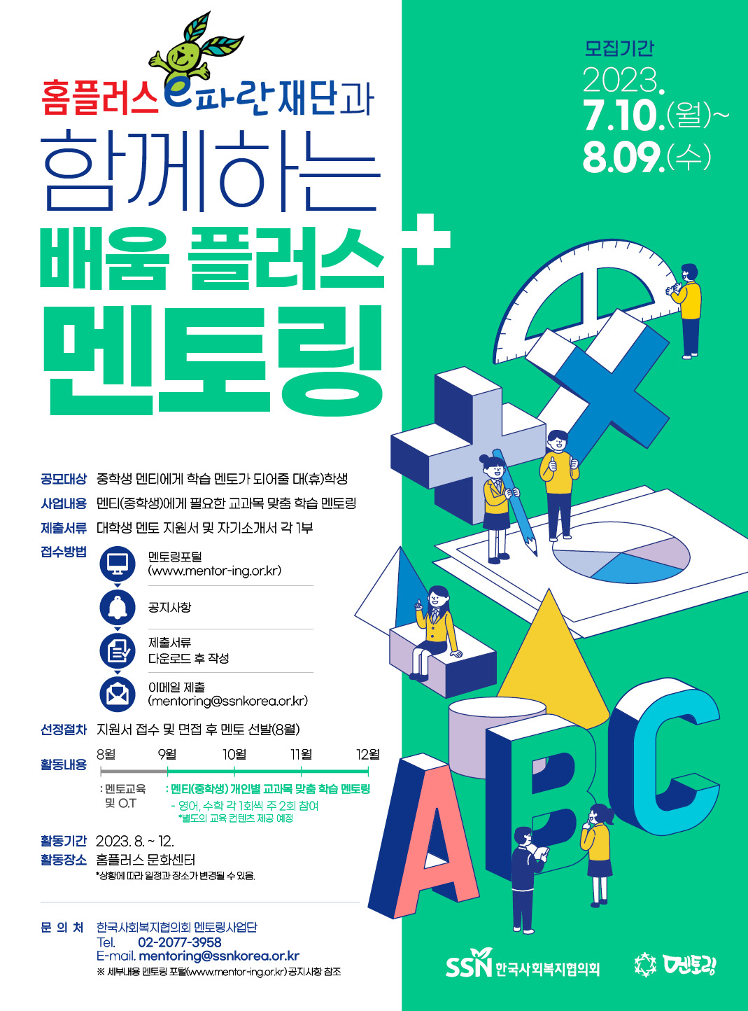 한국사회복지협의회 멘토링사업단에서는 홈플러스e파란재단과 함께 교육 취약 학생들에게 교육 기회를 제공하여 학업에 대한 흥미 유발 및 건전한 성장과 발달을 도모하고 다양한 재능을 가진 대학생들의 멘토링 참여를 통해 멘토와 멘티가 함께 성장할 수 있도록 『배움 플러스 멘토링』에 참여할 대학생 멘토를 모집합니다.
