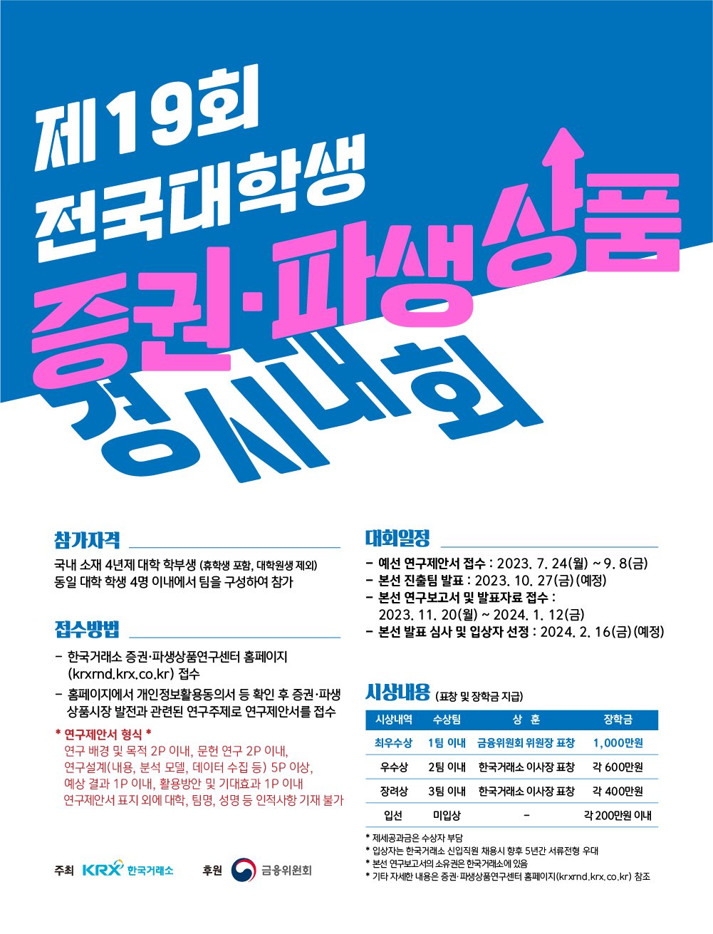 ■ 응모주제 - 제19회 전국대학생 증권·파생상품 경시대회 ■ 응모자격 - 국내 소재 4년제 대학 학부생(휴학생 포함\, 대학원생 제외) * 동일 대학 학생 4명 이내에서 팀을 구성하여 참가 ■ 응모일정 - 예선 연구제안서 접수 : 23.07.24(월) \~ 09.08(금) - 본선 진출팀 발표 : 23.10.27(금) *예정 - 본선 연구보고서 및 발표자료 접수 : 23.11.20(월) \~ 24.01.12(금) - 본선 발표 심사 및 입상자 선정 : 24.02.16(금) *예정 ■ 접수방법 -한국거래소 증권·파생상품연구센터 홈페이지를 통한 접수 * 홈페이지 바로가기 : https://krxrnd.krx.co.kr/main/main.jsp - 홈페이지에서 개인정보활용동의서 등 확인 후 증권·파생 상품시장 발전과 관련된 연구주제로 연구제안서를 접수 ■ 제출방법 (연구제안서 형식) - 연구 배경 및 목적 2P 이내\, 문헌 연구 2P 이내\, 연구설계(내용\, 분석 모델\, 데이터 수집 등) 5P 이상\, 예상 결과 1P 이내\, 활용방안 및 기대효과 1P 이내 *연구제안서 표지 외에 대학, 팀명, 성명 등 인적사항 기재 불가 ■ 시상내역 - 최우수상(1팀 이내) : 금융위원회 위원장 표창 및 장학금 1\,000만원 - 우수상(2팀 이내) : 한국거래소 이사장 표창 및 각 장학금 600만원 - 장려상(3팀 이내) : 한국거래소 이사장 표창 및 각 장학금 400만원 - 입선(미입상) : 장학금 각 200만원 이내 * 제세공과금은 수상자 부담 * 본선 연구보고서의 소유권은 한국거래소에 있음 ※ 특전 - 입상자는 한국거래소 신입직원 채용시 향후 5년간 서류전형 우대 ■ 기타 - 자세한 내용은 증권·파생상품연구센터 홈페이지(https://krxrnd.krx.co.kr/main/main.jsp) 알림마당(공지사항) 참조