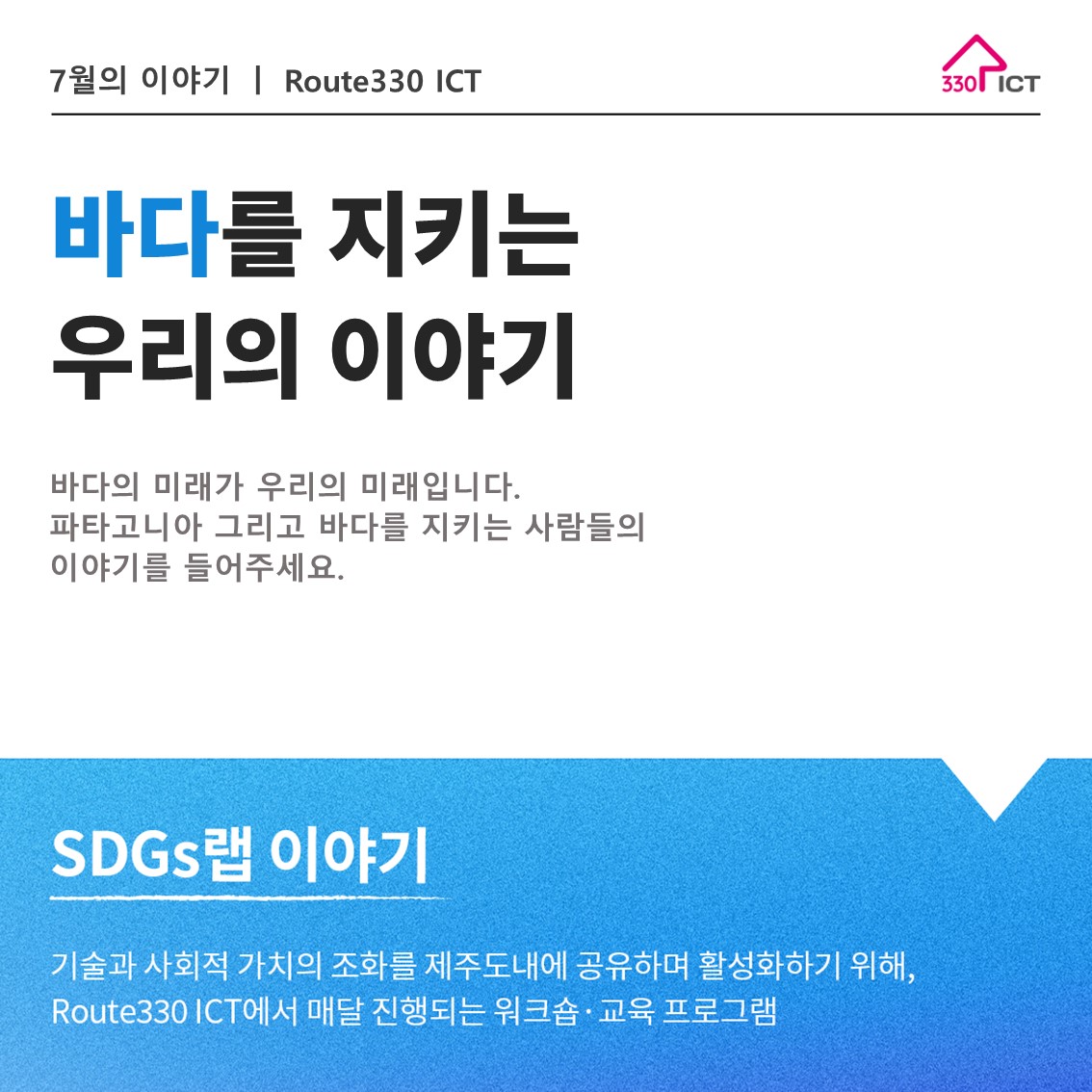 [7월 SDGs랩] 바다를 지키는 우리의 이야기 / Route330 ICT 안녕하세요, 제주 ICT 스타트업 지원사업 Route330 ICT에서 준비한, 7월 SDGs랩 주제를 소개합니다! UN회원국들이 정한 SDGs 14번 목표 '해양 생태계 보호'를 테마로, 바다의 위협이 되고 있는 해양 쓰레기 문제, 오염수 방류 문제, 해양을 해치는 어업 문제 등 현재를 점검하고, 해양 생태계 보호에 인식 있는 사람들이 한 자리에 모여 #해양생태계 #바다를 지키는 이야기 에 대해 강연을 듣고 서로의 생각을 나눠볼 수 있는 시간을 준비했습니다. ✔️주제 : 바다를 지키는 우리의 이야기 ✔️강연 : 파타고니아 환경팀 김광현 팀장 ✔️참여 : 바다 환경 활동가 및 바다 환경 지킴에 동참하는 누구나