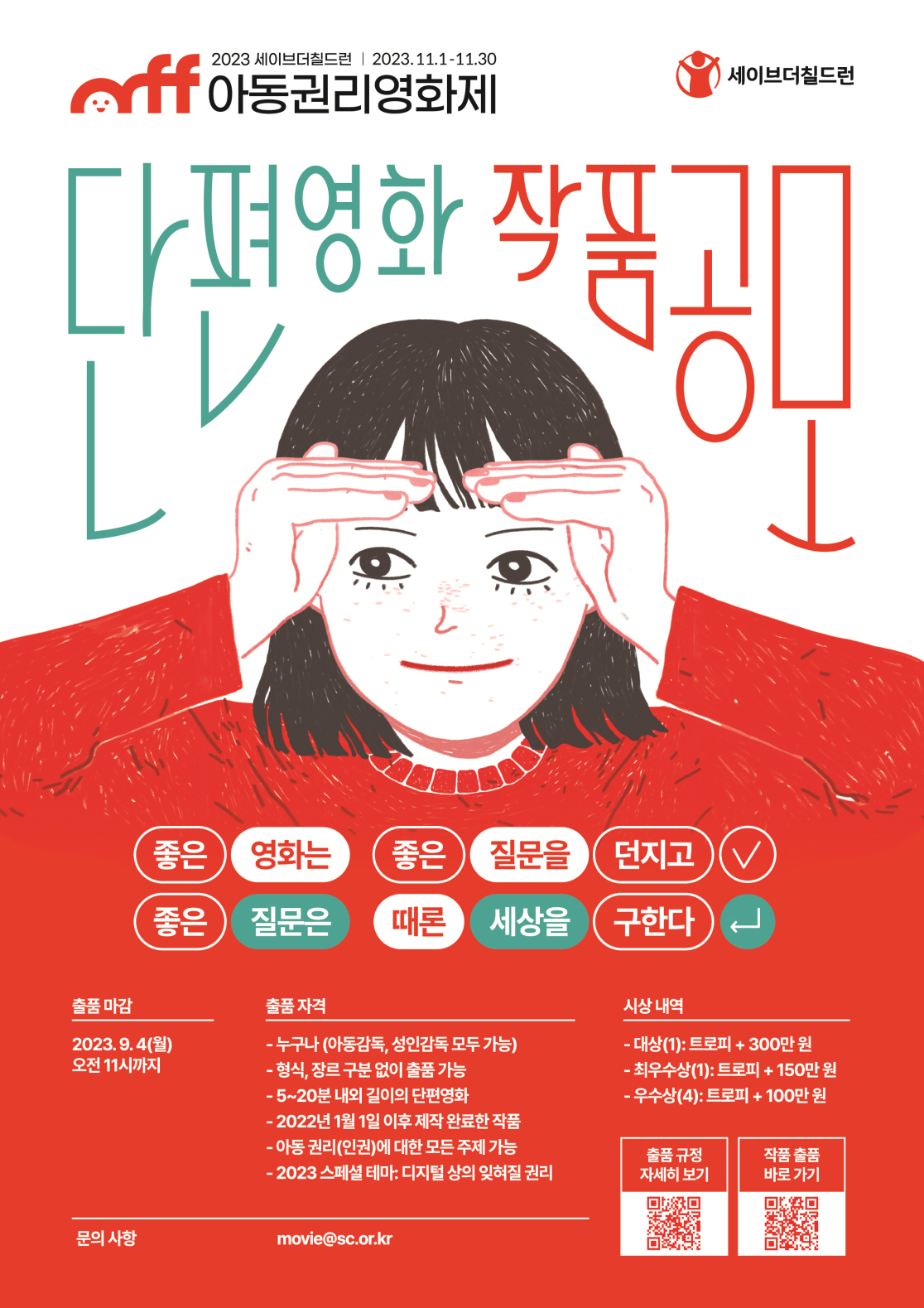 7. 유의사항 자세한 내용은 홈페이지에 있는 출품 규정 및 촬영 가이드라인을 확인해주시기 바랍니다. (본문 맨 아래의 링크를 클릭하시면 확인하실 수 있습니다) 8. 문의 아동권리영화제 사무국(세이브더칠드런) 전화: 02-6900-4470 \| 홈페이지: www.sc.or.kr/crff/ \| 이메일: movie@sc.or.kr 오늘날의 세계에 새로운 질문을 던지는 당신의 작품을 찾습니다. (클릭)**