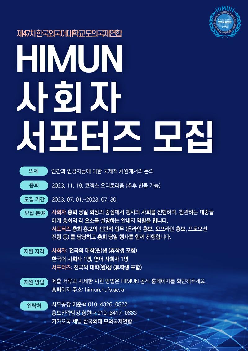 제47차 HIMUN 사회자∙서포터즈 모집 안내 HIMUN은 HUFS International Model United Nations의 약자로 한국외대 모의국제연합의 공식 영문 명칭입니다. 한국외국어대학교 모의국제연합은 전국의 대학(원)생들이 참여하여 직접 모의UN총회를 준비하는 범대학적 외국어 학술 단체입니다. 매년 공개총회프로그램을 통해 학생 및 일반인을 대상으로 유엔과 국제이슈에 대한 관심을 제고하는 데 기여하고 있습니다. 이를 위해 HIMUN 사회자와 서포터즈는 8월에 선발되어 총회 홍보 및 진행을 위한 교육과정, 리허설 과정을 거치게 됩니다. 이 과정을 통해 사회자와 서포터즈는 국제기구회의에 대한 전반적인 지식을 쌓게 되며, 대중에게 보다 쉽게 국제회의에 관한 지식을 전달하는 역할을 담당합니다. 예비 사회자∙서포터즈 여러분의 많은 관심과 지원 바랍니다. <제47차 모의유엔총회> 일시: 2023년 11월 19일(일) 장소: 코엑스 오디토리움 (추후 변동 가능) 주최: 한국외국어대학교 모의국제연합 의제: 인간과 인공지능에 대한 국제적 차원에서의 논의 ◆ 모집기간 7월 1일(토)\~7월 30일(일) 자정 마감 ◆ 모집분야 > 사회자 : 총회 당일 회장의 중심에서 행사의 사회를 진행하며\, 참관하는 대중들에게 총회의 각 요소들을 설명하는 안내자 역할을 합니다. (한국어 사회자 1명, 영어 사회자 1명 모집, 남녀 구별 없음) > 서포터즈 : 홍보전략팀 산하 구성원으로서 총회 홍보의 전반적 업무(온라인 홍보\, 오프라인 홍보\, 프로모션 진행 등)를 담당하고\, 총회 당일 행사를 함께 진행합니다. ◆ 지원자격 열정 가득한 대학(원)생, 휴학생, 졸업생