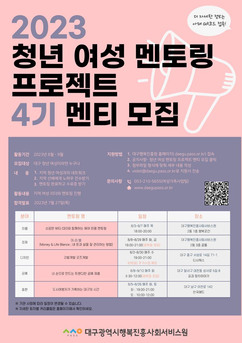 대구에 거주하는 청년 여성 여러분 환영합니다 본 프로그램은 대구광역시행복진흥사회서비스원이 기획하고 운영하는 청년 맞춤형 멘토링 프로그램입니다. <목적> 📌 직장인, 대학생, 경력단절 여성 등 청년 여성 분들께 네트워킹 및 교육을 제공함으로써 경험 및 기회를 드립니다. <대상> 📌 대구 2030 청년 여성이면 누구나 <모집인원> 📌 분야별 10명 내외 <모집일정> 📌 6월30일(금) \~ 7월23일(일) 24시00분까지! ⏰ <교육일정> 📌 8-9월 (분야별로 상이) <교육장소> 📌 분야별 상이 <참여혜택> 📌 멘토링 무료 참여, 수료증 발급 <문의 및 안내> 📌 053-210-5655 (대구행복진흥원 여성가족사업팀)