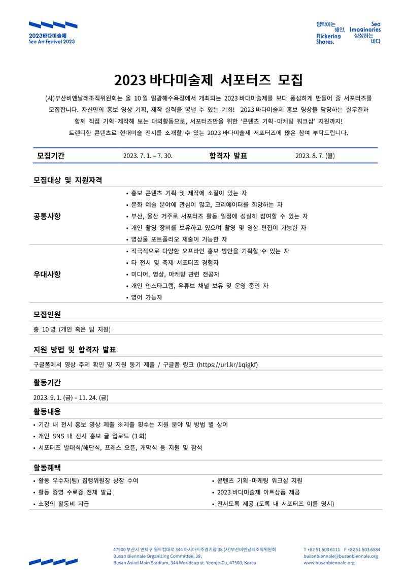 2023바다미술제 서포터즈 모집 (사)부산비엔날레조직위원회는 올 10월 일광 해수욕장에서 개최되는 2023바다미술제를 보다 풍성하게 만들어 줄 서포터즈를 모집합니다. 올해는 유튜브를 중심으로 서포터즈 활동을 구성하고, 부산에서 울산 지역까지 확대된 영상 콘텐츠를 직접 기획·촬영하여 새롭고 다양한 방식으로 전시를 소개하고자 합니다. 활동기간 내 콘텐츠 기획·마케팅 교육 관련 워크샵 참여까지 특별한 경험이 될 2023바다미술제 서포터즈에 많은 참여 부탁드립니다. [2023바다미술제] 전시 주제 : 《깜빡이는 해안, 상상하는 바다 (Flickering Shores, Sea Imaginaries)》 전시 일정 : 2023. 10. 14. (토) \~ 2023. 11. 19. (일) 전시 장소 : 일광 해수욕장 일대 ㅇ 모집인원 및 모집구분 : 총 10명 (개인 혹은 팀 지원) ※변동 가능 ㅇ 기간 및 일정 - 모집기간 : 2023. 7. 10. - 7. 30. - 서류발표 : 2023. 8. 7. - 면접심사 : 2023. 8. 17. - 최종발표 : 2023. 8. 21. - 활동기간 : 2023. 9. 1. - 11. 24. ㅇ 선정기준 및 우대조건 [공통사항] - 홍보 콘텐츠 기획 및 제작에 소질이 있는 자 - 문화 예술 분야에 관심이 많고, 크리에이터를 희망하는 자 - 부산, 울산 거주로 서포터즈 활동 일정에 성실히 참여할 수 있는 자 - 개인 촬영 장비를 보유하고 있으며 촬영 및 영상 편집이 가능한 자 - 영상물 포트폴리오 제출이 가능한 자 [우대사항] - 적극적으로 다양한 오프라인 홍보 방안을 기획할 수 있는 자 - 타 전시 및 축제 서포터즈 경험자 - 미디어, 영상, 마케팅 관련 전공자 - 개인 인스타그램, 유튜브 채널 보유 및 운영 중인 자 - 영어 가능자 ㅇ 활동내용 - 기간 내 전시 홍보 영상 제출 ※제출 횟수는 영상 콘텐츠 별 상이 - 개인 SNS 내 전시 홍보글 업로드 (3회) - 서포터즈 발대식, 해단식, 2023바다미술제 프레스 오픈, 개막식 등 지원 및 참석 ㅇ 분야별 콘텐츠** - 1인당 1개 이상의 주제를 선택하여 서포터즈 활동을 수행하면 됩니다. (주제 1개 선택, 영상 1회 제출. 최대 2개 선택 가능) 팀 지원의 경우 3인이 개의 팀을 이루어 총 3개의 영상을 제작하게 됩니다. - 아래 내용은 예시이며 새롭고 자유로운 기획 또한 가능합니다. - 사전 홍보의 경우 전시 개막 이전 홍보를 위해 사용될 영상 콘텐츠이기에 타 영상과 제출 기한이 상이합니다. ※제출 기한 사후 안내