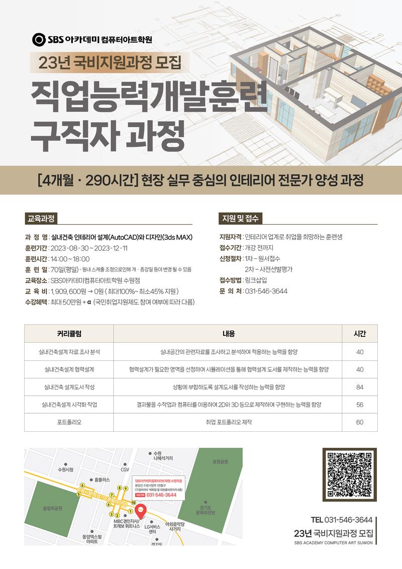 인테리어 실무 기술을 학습하고 취업을 위한 포트폴리오까지 제작 할 수 있는 과정입니다.