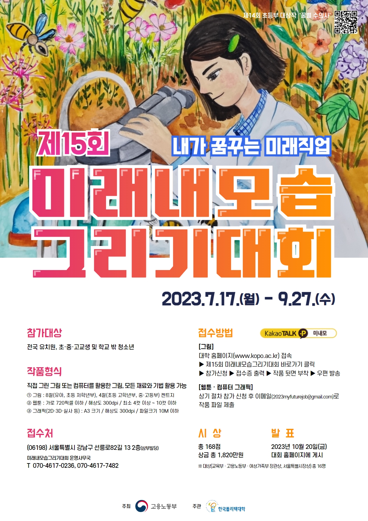 O 접수기간 -2023.7.17(월) - 9.27(수) O 참가대상 -전국 유치원, 초·중·고교생 및 학교 밖 청소년 O 작품형식 -직접 그린 그림 또는 컴퓨터를 활용한 그림 모든 재료와 기법 활용 가능 ① 그림 : 8절(유아, 초등 저학년부), 4절(초등 고학년부, 중*고등부) 켄트지 ② 웹툰 :가로 720픽셀 이하 / 해상도 300dpi / 최소 4컷 이상\~10컷 이하 ③ 그래픽(2D*3D*실사 등) : A3크기 / 해상도 300dpi / 파일크기 10M 이하 O 접수처 -(06198) 서울특별시 강남구 선릉로82길 13 2층(삼부빌딩) 미래내모습그리기대회 운영사무국 T.070-4617-0236, 070-4617-7482 O 접수방법 -[그림] 대학홈페이지(https://myfuturejob2023.co.kr) 접속 ▶제15회 미래내모습그리기대회 바로가기 틀릭 ▶참가신청▶접수증 출력▶작품 뒷면 부착▶우편 발송 -[웹툰*컴퓨터 그래픽] 상기 절차 참가 신청 후 이메일(2023myfuturejob@gmail.com)로 작품 파일 제출 O 시상 -총 168점 / 상금 총 1,820만원 O 발표 -2023년 10월 20일(금) 대회 홈페이지에 개시 ※대상(교육부*고용노동부*여성가족부 장관상, 서울특별시장상) 총 16명