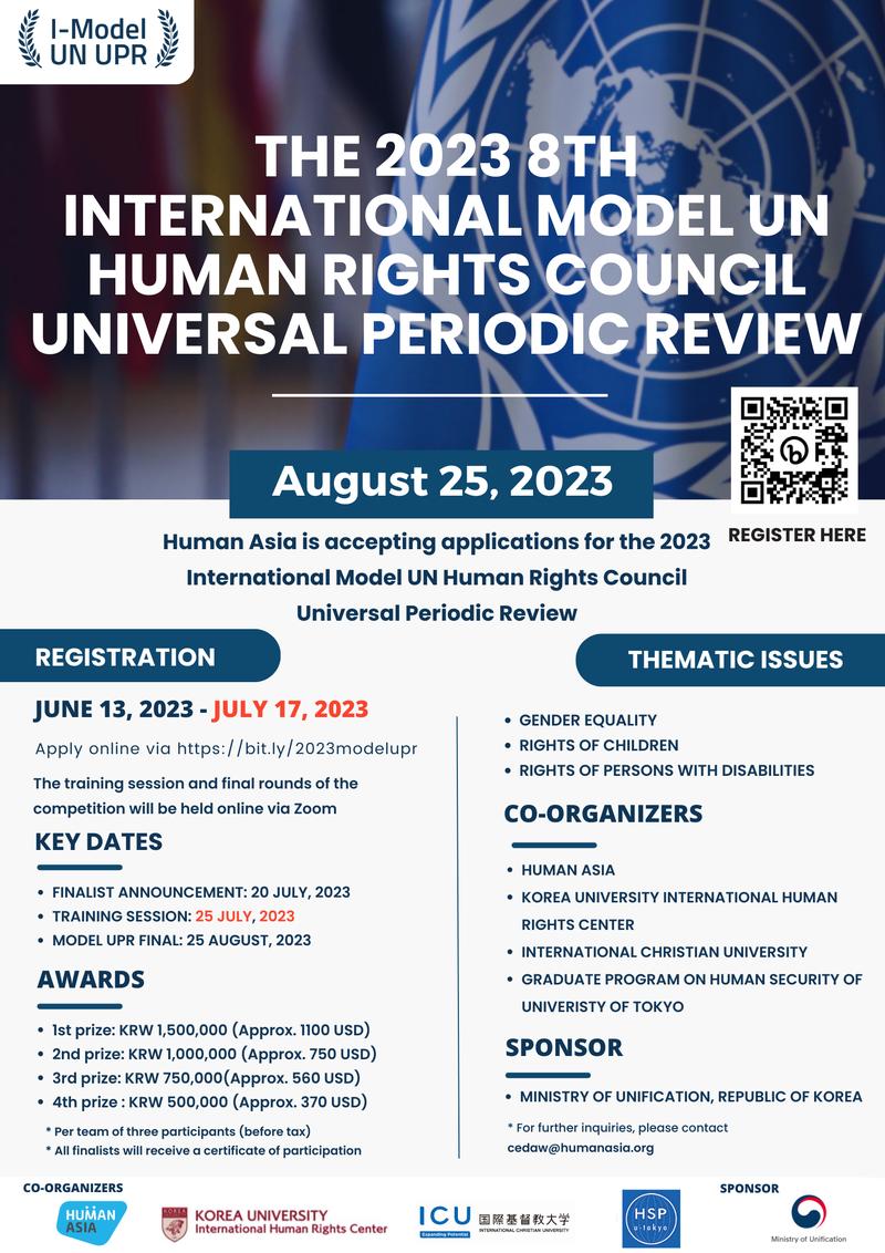 ○ 지원자격: 국내 및 아시아지역 국적의 대학(원)생 ○ 참가 신청 마감: 2023.07.17 ○ 지원 방법: 신청 링크 https://bit.ly/2023modelupr 또는 QR 코드 스캔 ○ 일정: -참가자 발표: 2023.07.20 -트레이닝 세션: 2023.07.25 -모의 URP 대회: 2023.08.25 ○ 주제: -성평등 -아동권 -장애인 인권 ○ 언어: 영어 ○ 시상내역: 대상: 상금 150만원 최우수상: 상금 100만원 우수상: 상금 75만원 장려상: 상금 50만원 * 팀 단위로 지급(세전)