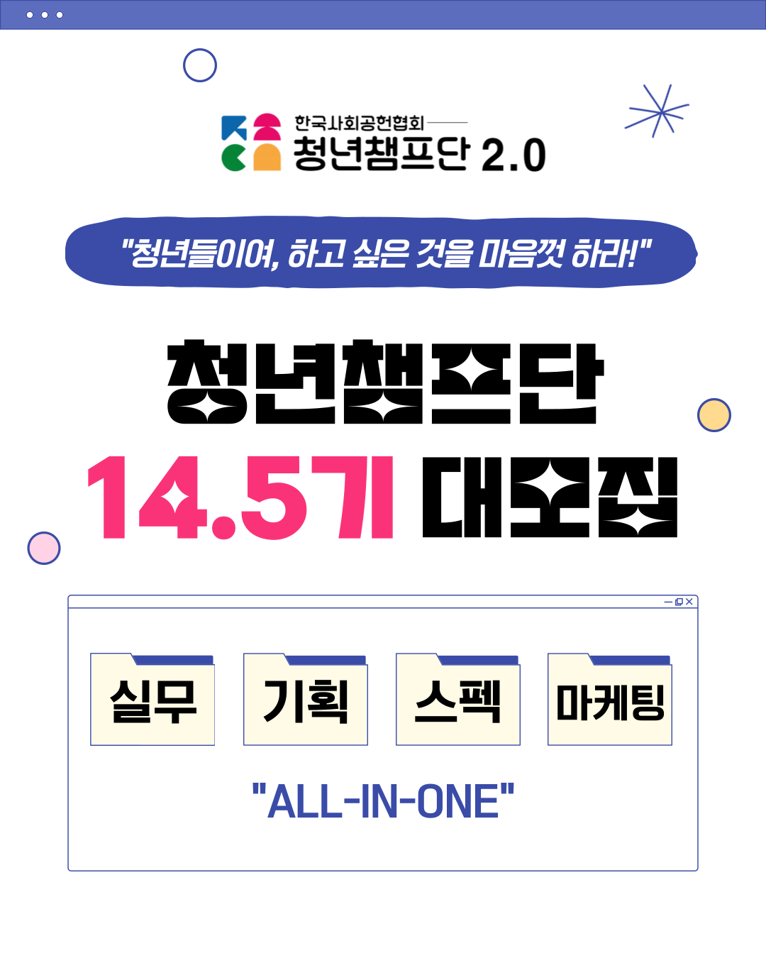 ○ 청년챔프단이란? - 사회공헌 프로젝트로 나의 아이디어를 직접 실현시켜볼 수 있는 기회 - 현직 전문가 멘토링 기반의 프로젝트 실무 경험 쌓기 - 주도적으로 나의 능력과 가능성을 찾아내기 위한 도전 - 자신의 성장을 위해 끊임없이 도전하는 청년들과의 네트워크 형성 ○ 모집 대상: 함께하라, 즐겨라, 주도하라(together, enjoy, lead&leader)의 가치에 공감하는, 만 18세 이상 전국 청년 (대학생, 취준생, 직장인 모두 지원 가능) 함께하라: 다양한 사람들을 만나 서로의 재능을 통해 사회공헌 프로젝트를 함께하라 즐겨라: 새로운 경험을 통해 시야를 넓히고 성장하는 내 자신을 즐겨라 주도하라: 프로젝트 미션 수행을 통해 작은 실패와 성공을 반복하며 자기 삶을 주도하라 ○ 모집 인원: 00명 ○ 모집 기간 및 일정 - 모집 기간: 2023년 7월 12일 \~ 2023년 7월 23일 - 1차 합격자 발표: 7월 25일 - 2차 면접 일정: 7월 29일 \~ 30일 - 예비단원 합격자 발표: 7월 31일 - 예비단원 온라인 발대식: 8월 2일 - 멘토 간담회: 8월 22일 \~ 8월27일 팀별 일정 조율 - 14기 정식단원 출범식: 9월 2일 ○ 활동 장소: 수도권 위주 (사회공헌데이는 서울에서 진행됩니다.) ○ 활동 내용 [예비단원 - 4주] - 1주차: 조편성 및 프로젝트 기획 - 2주차: 프로젝트 실행 - 3주차: 프로젝트 실행 - 4주차: 결과 보고서 제출, 현직 전문가 멘토링 및 조별 간담회 진행 ★ 예비단원 과정 중 한국사회공헌협회 공식 캠페인 1회, 특강 1회 이상 참여 필수 (공식 캠페인 일정 추후 안내, 협회 캠페인 특강: 8월 매주 토, 일 14시 총 8회 진행 / 장소: 한국사회공헌협회) [정식단원 - 1년 이상] - 4개월 단위의 사회공헌 프로젝트 기획 및 실행(연 3회) - 2개월 단위의 상호 피드백 사회공헌 어빌리티 작성 - 매달 마지막 주 토요일 사회공헌데이 참여 - 한국사회공헌협회 공식 캠페인 참여 - 현직 전문가 멘토링 ○ 정식 단원 활동 증명서 발급 기준 - 활동 기간 최소 1년 - 협회 캠페인 8회 이상 참여 - 사회공헌데이 10회 이상 참여 ○ 활동 혜택 -4개월 단위 나만의 경쟁력 있는 스펙&포트폴리오 -국내 최초(유일) 사회공헌자격증 응시자격 부여 -인플루언서&올림픽스타 등 유명인사와 함께하는 사회공헌활동 -활동 국내 외신 보도 (포털 검색 시 확인 가능) -2개월 단위, 나의 능력치 직접 피드백(사회공헌어빌리티) -전문가 멘토 상시 피드백 (교수,기자,사업가,마케터,대기업 실무자 등) -사회인사&기관 표창 -다양한 자격증 무료 수강(상상교육) -모든 사회공헌 활동 봉사시간 수여(1365) -ESG교육, 마케팅 실무 글쓰기 등 트랜디한 교육 무료제공 ○ 지원 방법: 아래 링크를 통한 신청서 작성 https://forms.gle/eHaLEkTJUgXphC799 ○ 공식 사이트/SNS ▼ 한국사회공헌협회 사이트 ▼ https://kscas.org ▼ 2023년 하반기, 진행중인 프로젝트 자세히 보기 ▼ https://blog.naver.com/youth_champ/223151461451 ▼ 청년챔프단 인스타그램 ▼ https://instagram.com/ksca2017?igshid=NTc4MTIwNjQ2YQ== ▼ 청년챔프단 14기 모집글 자세히 보기 ▼ https://kscas.org/community/notice/82 ○ 문의처 - 이메일: ksca2017@naver.com - 카카오톡 플러스 친구: 한국사회공헌협회