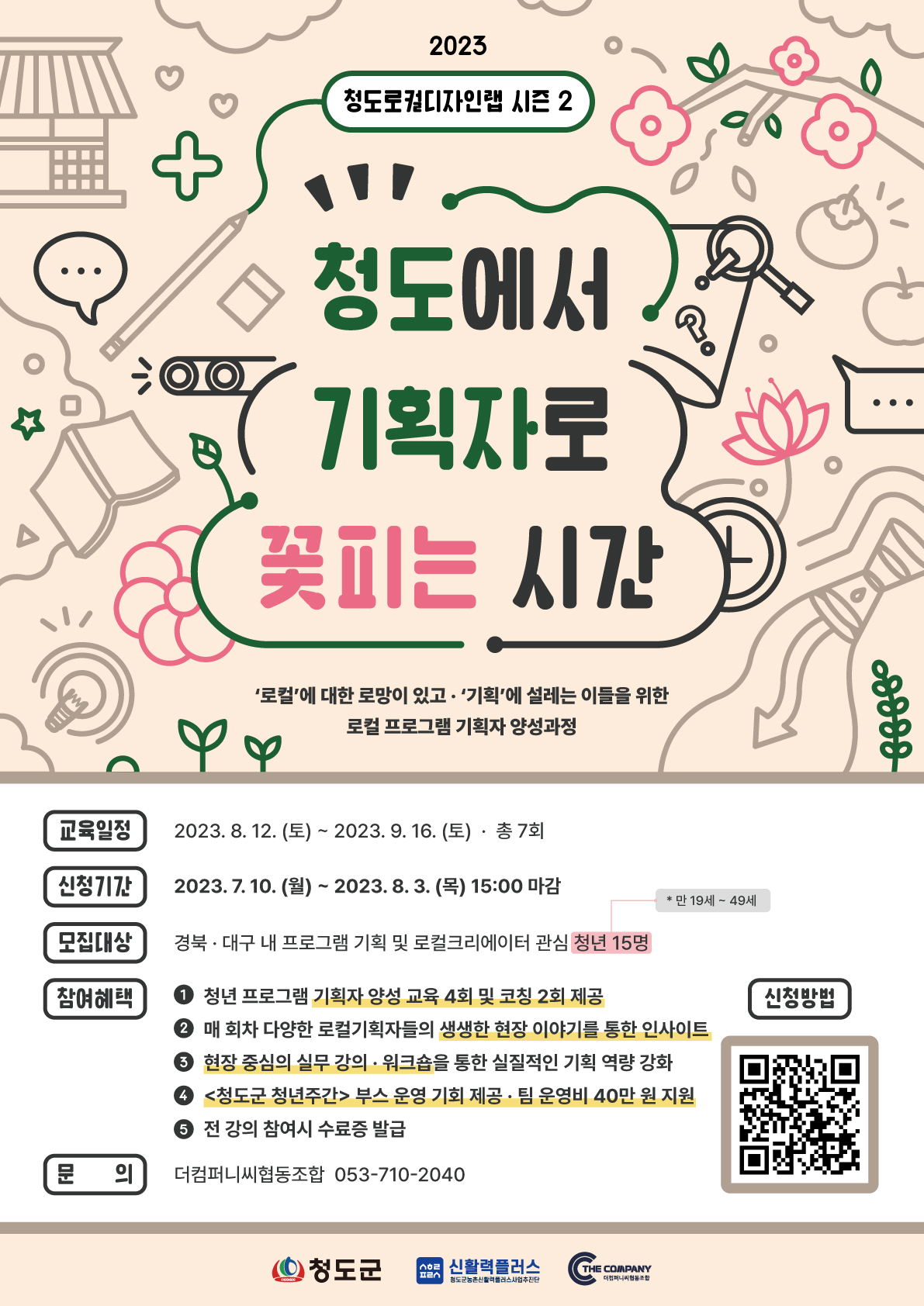 <2023 청도로컬디자인랩 시즌2 - 로컬에서 기획자로 꽃피우기> 로컬 기획자 양성과정 프로그램⭐️참여자를 모집⭐합니다! '로컬'에 설레고, '기획'이 궁금한 경북/대구 청년(만 19\~49세)이라면 누구나 대환영, 청도에서 청년 프로그램 기획에 대한 교육부터 실습까지 핵심 A-Z 알려드립니다 !! '로컬기획자'로 '청도' 로컬과 나의 새로운 매력을 알아가고, 💡나만의 아이디어💡를 현실로 펼칠 수 있는, 기회가 있는 청도에서 활짝 꽃 피우세요🌼🌼 주최 | 청도군·청도군농촌신활력플러스사업추진단 주관 | 더컴퍼니씨협동조합 ⭐교육을 꼭 참여해야 하는 이유⭐ 1. ‘청년 프로그램 기획자’ 양성 교육 4회, 코칭2회⚡ 2. 매 회차 다양한 로컬 기획자들의 생생한 이야기로인사이트🔎 3. 현장중심 ‘실무 강의/워크숍’을 통한 실질적인기획역량 강화🌱 4. <청도군 청년주간> 부스운영 기회 제공(팀 운영비 40만원 지원)🎪 5. 전체 회차 참여시,수료증발급🎁 🔥신청 링크 -https://url.kr/uxf8vj🔥 <신청 개요> 📌신청 기간 : 7월 10일(월)\~8월 3일(목) 15:00 까지 📌모집 대상 : '로컬'과 '프로그램/퍼포먼스(행사) 기획' 분야에 관심 있는 & 대구·경북, 청도군 내 거주하고 있는 청년(만 19세 이상 49세 이하) 📌모집 인원 : 총 15명 📌심사 일정 [서류심사] 8월 4일(금) : 면접 대상자 개별 문자 안내 [면접심사] 8월 7일(월) : 온라인(ZOOM) 진행 [최종선발] 8월 8일(화) : 합격 여부 개별 문자 안내 <교육 개요> 📌교육장소 : 청도군 화양읍 일대 (* 세부 장소 추후 안내 예정) 📌세부일정 : [교육] 8월 - 12일, 19일, 26일, 9월-2일, (매주 토요일), 13:00\~17:30 / 총4회 [코칭] 9월 2주\~3주 중 (*팀별 개별 코칭) / 2회 [실습] 9/16일(토) <청도군 청년주간> 부스 운영 🔥신청 링크 -https://url.kr/uxf8vj🔥 🔎로컬에서 새로운 활력을 찾아주는, 청도군 농촌신활력플러스사업추진단이 궁금하다면? 👉인스타그램 바로 가기 🔎진짜 문제를 찾고 솔루션을 기획하는, 더컴퍼니씨협동조합이 궁금하다면? 👉인스타그램 바로 가기 👉네이버 블로그 바로 가기