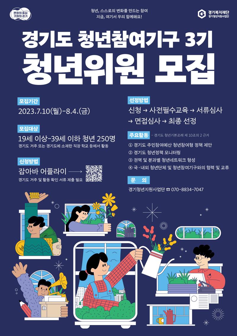 ○ 활동기간 : 위촉일로부터 1년 ○ 모집대상 : 19세 이상\~ 39세 이하 경기도 청년 250명 ※ 경기도 청년 정책 및 청년 관련 이슈에 관심이 있는 청년 중 아래의 1\~3번 중 한 가지 이상 해당되는 분 (관련 해당사항에 있어 주민등록등본, 재직증명서, 재학증명서) 1.경기도에 거주하는 청년 2.경기도에 소재한 직장에서 근무하는 청년 3.경기도에 소재한 학교에 재학 중인 청년