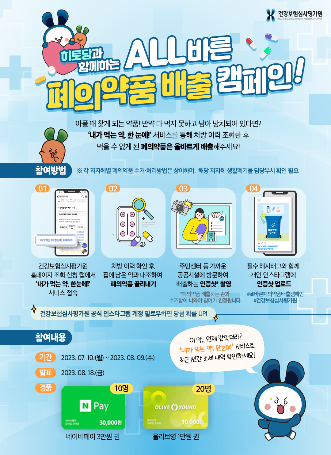 처치곤란인 폐의약품, 어떻게 버려야 할지 고민이라면? 건강보험심사평가원의 'ALL바른 폐의약품 배출 캠페인'에 참여하셔서 환경도 보호하고, 건강도 챙기는 거 어떨까요?