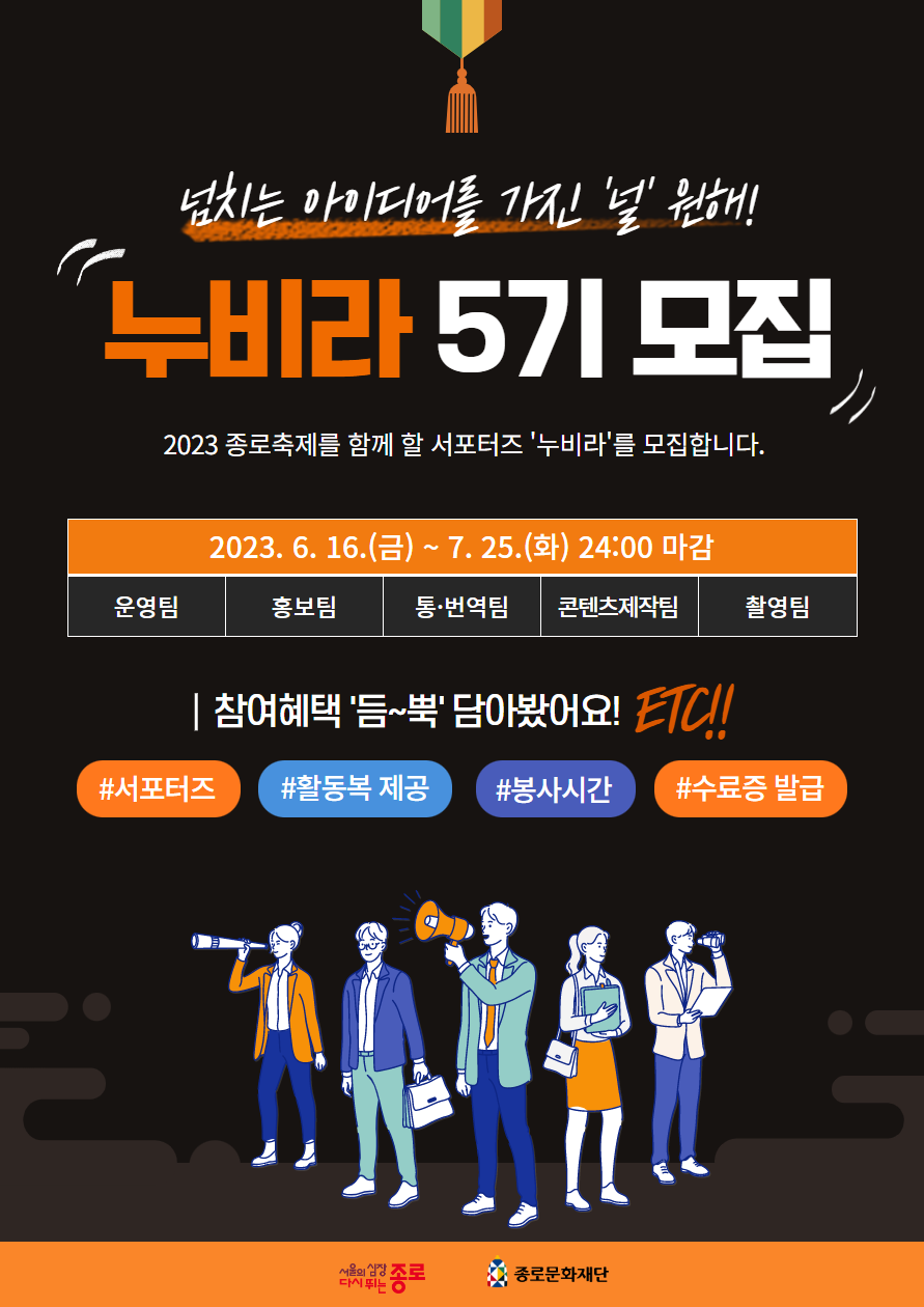 종로문화재단 2023 종로축제 서포터즈 누비라 모집(연장) ■ 공모 내용 - 운영팀\, 홍보팀\, 통·번역팀\, 콘텐츠 제작팀\, 촬영팀 ■ 지원 자격 - 만 19세 이상 39세 이하 청년 - 발대식\, 사전교육 필수참석 및 축제기간(3주 중) 1주 이상 축제일정 참여가능한 자 ■ 모집 기간 - 2023. 6. 16.(금) \~ 7. 25.(화) 24:00 마감 ※마감시간 이후 접수 불가 ■ 지원 방법 - 이메일 지원 ( ycg@jfac.or.kr ) ■ 활동 내용 - 2023 종로축제 운영 및 현장지원 등 ■ 활동 혜택 - 종로축제 서포터즈 활동 내용 자원봉사 시간 인정 ※1365 자원봉사 포털 연계 - 종로축제 서포터즈 활동 종료 후 수료증 발급 - 우수 서포터즈 종로구청장상 수여 - 종로축제 서포터즈 현장 활동 시 활동복 제공 - 내부 기준에 따른 소정의 서포터즈 활동비 지급(※운영팀\, 콘텐츠제작팀 해당) - 종로구 및 종로문화재단 문화프로그램 참여 기회 제공 ■ 문의 사항 - 종로문화재단 문화사업부(070-4600-5724)