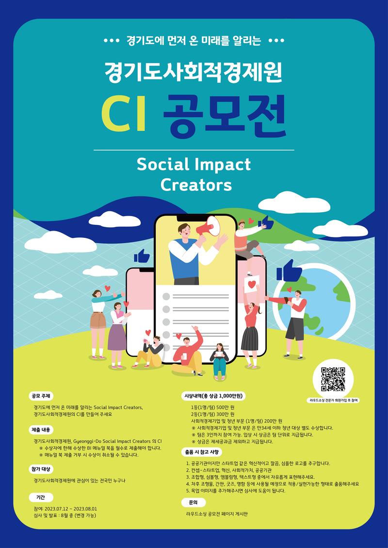 경기도사회적경제원 CI 공모전 ■공모 주제 경기도에 먼저 온 미래를 알리는 Social Impact Creators(GSIC), 경기도사회적경제원의 CI를 만들어 주세요 경기도사회적경제원의 미션인 “경기도민의 더 나은 삶을 위한 사회혁신경제 생태계 구축" 과 "경기도에 먼저온 미래를 국내에 전파하는 사회적 영향력 제고” 경기도사회적경제원의 비전인 “경기도가 마주할 미래사회의 지속가능발전 과제를 민-관-사회혁신경제 조직이 함께 탐색하고 실행하도록 돕는 사회혁신경제의 중추기관”을 표현할 수 있는 이미지의 브랜드 로고를 여러분들의 아이디어를 통해 만들어가고자합니다. ※ 더 자세한 경기도사회적경제원의 정보는 첨부파일 및 아래 사이트에서 확인 가능합니다. 「경기도사회적경제원 SNS」 경기도사회적경제원 블로그 : https://blog.naver.com/ggsic 경기도사회적경제원 인스타그램 : https://www.instagram.com/ggsic_official/ 경기도사회적경제원 페이스북 : https://www.facebook.com/ggsic.official ■제출 내용 경기도사회적경제원, Gyeonggi-Do Social Impact Creators(GSIC) 의 CI ※ 수상자에 한해 수상한 CI 메뉴얼 북을 필수로 제출해야 합니다. ※ 매뉴얼 북 제출 거부 시 수상이 취소될 수 있습니다. ■참가 대상 경기도사회적경제원에 관심이 있는 전국민 누구나 ■시상내역(총 상금 1,000만원) 1등(1명/팀) 500만 원 2등(1명/팀) 300만 원 사회적경제기업 및 청년부문 (1명/팀) 200만원 ※ 사회적경제기업 및 청년 또한 1등/2등에 선정 가능합니다. ※ 사회적경제기업* 및 청년(만 34세 이하) 부문은 별도 수상합니다 *사회적경제기업 기준 : 인증사회적기업 및 사회적협동조합, 「경기도 사회적경제 육성 지원에 관한 조례」 제10조 1항에 따른 예비사회적기업, 마을기업, 협동조합 , 자활기업 등 ※ 팀은 3인까지 참여 가능. 입상 시 상금은 팀 단위로 지급됩니다. ※ 상금은 제세공과금 제외하고 지급됩니다. ■기간 참여: 2023.07.12 \~ 2023.08.01 심사 및 발표 : 8월 중 (변경 가능) ■출품 시 참고 사항 1. 공공기관이지만 스타트업 같은 혁신적이고 깔끔\, 심플한 로고를 추구합니다. 2. 컨셉 – 스타트업\, 혁신\, 사회적가치\, 공공기관 3. 조합형\, 심볼형\, 엠블럼형\, 텍스트형 중에서 자유롭게 표현해주세요. 4. 차후 조형물\, 간판\, 굿즈\, 명함 등에 사용될 예정으로 적용/실현가능한 형태로 출품해주세요 5. 목업 이미지를 추가해주시면 심사에 도움이 됩니다. ■문의 라우드소싱 공모전 페이지 게시판 ■유의사항 1) 수상작으로 선정된 참여자와 의뢰자의 저작재산권 (2차적 저작물 작성권 포함) 양도 동의가 이루어진 아이디어는 당사에 귀속됩니다. 2) 수상자는 저작재산권 및 2차적 저작물 작성권 양도에 동의하는 계약을 별도 체결할 수 있으며, 본 공모전에 응모하는 참여자는 해당 내용에 동의한 것으로 간주합니다. 3) 수상자에게 주어지는 상금은 저작재산권 양도에 따른 비용입니다. 4) 수상이 확정 된 작품은 반환되지 않습니다. 5) 응모 작품은 반드시 본인의 창작물이어야 하며 타인의 저작권을 침해하거나 제 3자에 대한 명예훼손 등의 문제가 발생할 경우 민/형사상의 책임은 본인에게 있습니다. 발표 후 저작권 침해 등에 대한 문제 확인 시 수상 취소 및 상금 환수 조치 합니다. 6) 수상작에 한해 일부 수정 요청이 발생할 수 있습니다. 7) 기타 세부 사항은 라우드소싱의 [개인정보 처리방침] 및 [작품 등록 약관]을 참조하시기 바랍니다