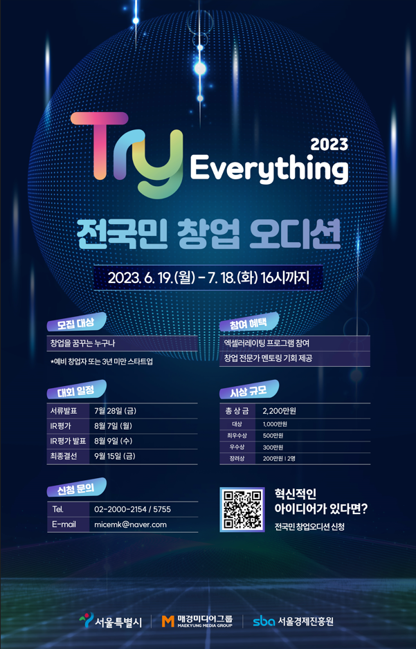 1. 행사개요 1) 행 사 명 : Try Everything 2023 전국민 창업 오디션 2) 기 간 : 2023년 6월 19일 (월) - 2023년 7월 18일 (화) 16:00까지 3) 하단의 접수하기를 통한 스타트업 플러스 홈페이지 온라인 접수 접수하기