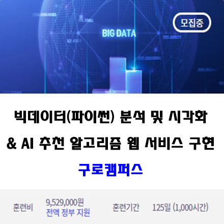 [더조은아카데미 - 구로캠퍼스] 훈련과정 - [K-Digital] 빅데이터(파이썬) 분석 및 시각화 & AI 추천 알고리즘 웹 서비스 구현 양성과정 교육일정 - 2023년 08월 30일 \~ 2024년 03월 04일 교육시간 - 09:30 \~ 18:30 (주5일 수업 / 일일 8시간) 교육비용 - 전액국비지원 교육문의 - 02-703-7025 / ocm7607@naver.com