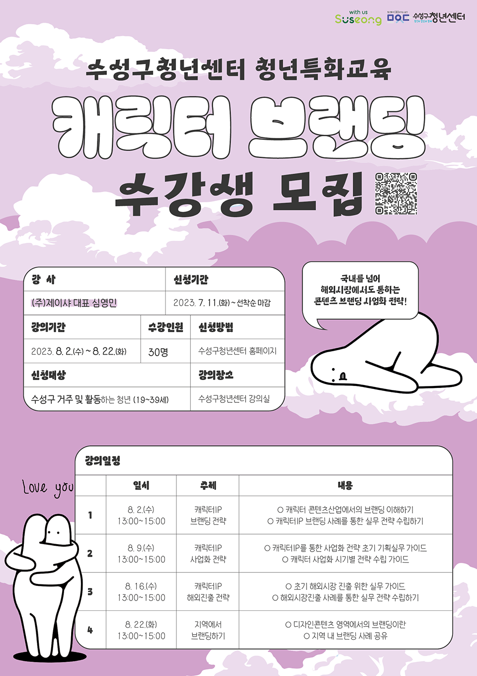 수성구청년센터 청년특화교육 캐릭터 브랜딩 수강생을 모집합니다. 삼성/kt/세븐일레븐/CU와 함께한 대구 디자인콘텐츠회사의 대표에게 배우는 글로벌 콘텐츠 브랜딩 사업화 전략