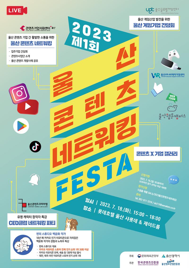 10년째 카카오 인기 이모티콘으로 자리잡은 펀피스튜디오 백윤화 작가님과 함께하는 CEO클럽 네트워킹 파티를 진행합니다. 온·오프라인 모두 참여 가능하니 많은 참여 부탁드립니다! 오프라인은 선착순 마감이니 서둘러 접수하세요\~! [모집 개요] ■일 시 : 2023. 7. 18(화) 15:00 \~ 17:00 ■장 소 : (오프라인)롯데호텔 울산 샤롯데홀 (온 라 인)울산콘텐츠코리아랩 유튜브 ■신청기한 : 2023. 7. 16.(일) 16:00 까지(오프라인 선착순 마감) ■모집대상 : 캐릭터를 좋아하는 울산 시민 누구나 & 울산 캐릭터 창작자 ■신청방법 : 온라인 구글폼 신청(bit.ly/2023울산콘텐츠네트워킹) ■리 워 드 : 오프라인 참석자 참여기념품 제공 ■문의 : 운영사무국 052-911-3316 / da213@semakers.co.kr