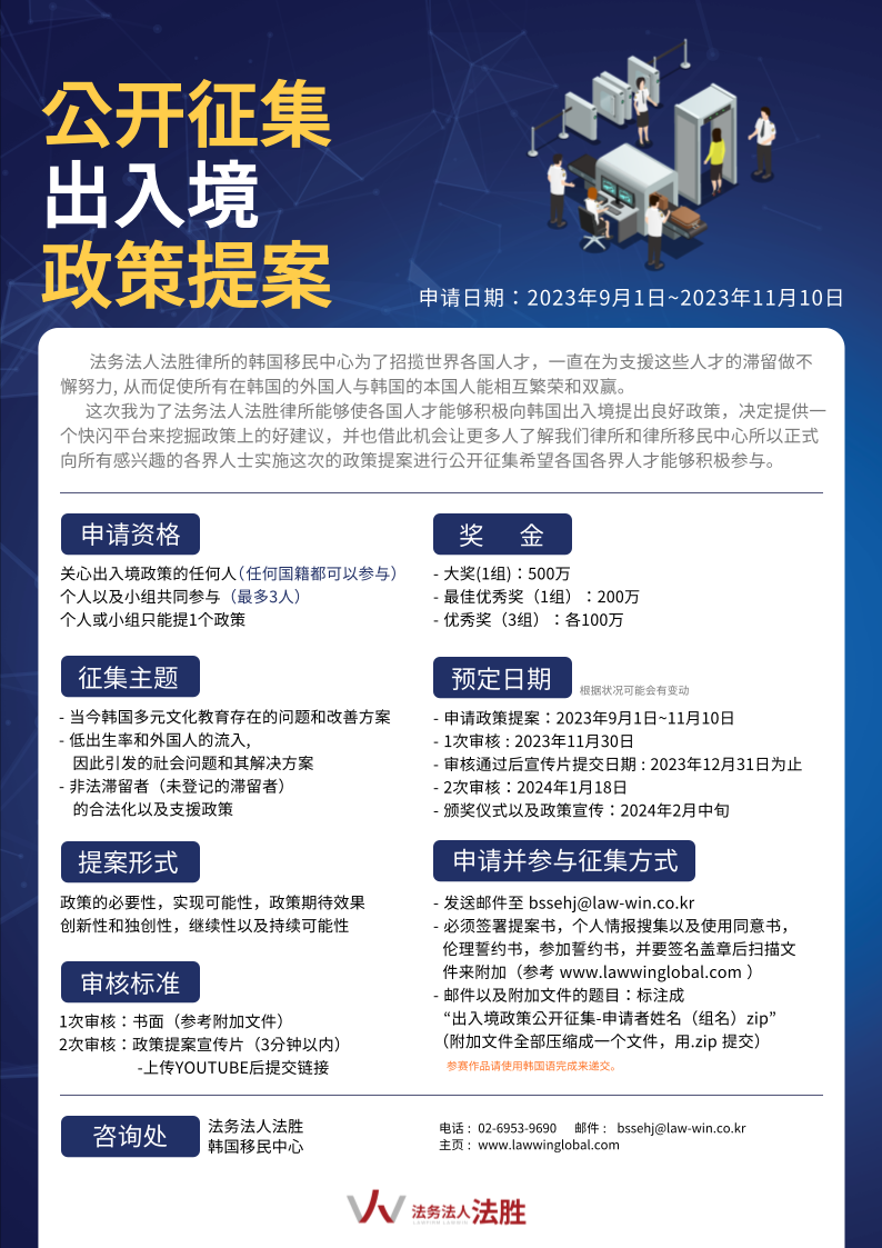 출입국 정책 제안 공모전 법무법인 법승 한국이민센터는 세계 각국의 인재들의 체류지위 획득을 지원함으로써 상호 번영을 위한 연대의 초석이 될 수 있도록 노력하고 있습니다. 이러한 취지에서 법무법인 법승은 다양한 국적의 지원자들이 출입국 정책을 제안할 수 있는 장을 열어 정책 아이디어를 발굴·홍보하고자 출입국 정책 제안 공모전을 실시하오니 여러분의 많은 참여 바랍니다. ○ 접수 기간: 2023년 9월 1일\~2023년 11월 10일 ○ 공모 자격: - 출입국 정책에 관심이 있는 누구나(국적 무관) - 단독 및 공동(최대 3인) 참여, 참가자(팀)당 1개 정책 제안 가능 ○ 공모 주제: - 다문화 교육의 문제와 그 개선방안 - 외국인 유입, 그로 인해 발생할 사회문제와 그 해결방안 - (미등록 체류자)의 합법화 및 지원 정책 ○ 제안 형식: 1차 심사: 서면 (첨부파일 서식 참고) 2차 심사: 정책제안 홍보 동영상(3분 이내)-유튜브에 업로드 후 URL 제출 ○ 총상금: 1,000만원 - (1팀): 500만원 - (1팀): 200만원 - (3팀): 각 100만원 ○ 접수 및 공모 방법 - (bssehj@law-win.co.kr)로 제출 - 개인정보 수집 및 활용 동의서, 윤리서약서, 참가서약서는 반드시 서명 날인 후 스캔하여 파일 첨부 (홈페이지 www.lawwinglobal.com의 공지 참조) - 메일 및 첨부파일 제목:“출입국정책 공모전_신청자명(팀명)zip”으로 표기 (첨부파일을 모두 작성 후 하나의 압축파일.zip으로 제출)