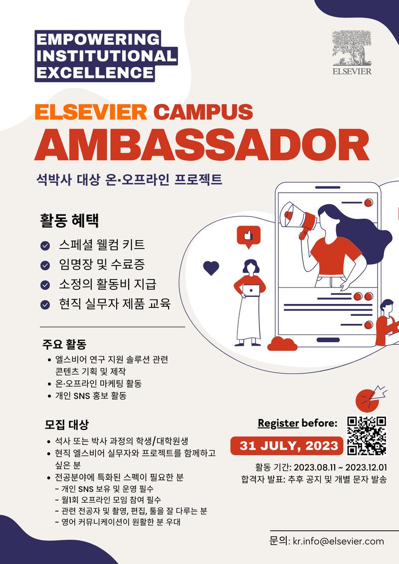 엘스비어 코리아에서 석박사를 대상으로 "엘스비어 캠퍼스 앰배서더"를 모집합니다. 연구 지원 솔루션을 현직 실무 담당자에게 직접 교육을 받고 사용해 볼 수 있는 좋은 기회가 될 것입니다. 연구자로써 필수적인 제품을 가장 잘 사용하게 될 수 있는 기회인 만큼 많은 분들의 참여를 기다리고 있습니다. 보다 자세한 사항은 포스터 및 웹페이지를 참고해주세요.