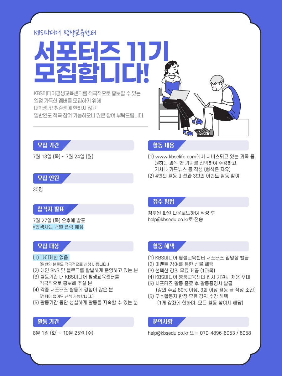 KBS미디어평생교육센터를 적극적으로 홍보할 수 있는 열정이 가득한 멤버를 모집하기 위해 대학생 및 취준생에 한하지 않고 일반인도 적극 참여 가능하오니 많은 참여 부탁드립니다. ■ 모집 기간 7월13일(목) \~ 7월24일(월) ■ 모집 인원 30명 ■ 합격자 발표 7월27일(목) 오후에 발표, 합격자는 개별 연락 예정 ■ 모집 대상 (1) 나이제한 없음 (일반인 분들도 적극적으로 신청 바랍니다.) (2) 개인SNS 및 블로그를 활발하게 운영하고 있는 분 (3) 활동기간 내 KBS미디어평생교육센터를 적극적으로 홍보해 주실 분 (4) 각종 서포터즈 활동에 경험이 많은 분 (경험이 없어도 신청 가능합니다.) (5) 활동기간 동안 성실하게 활동을 지속 할 수 있는 분 ■ 활동 기간 8월1일(화) \~ 10월25일(수) ■ 활동내역 (1) www.kbselife.com에서 서비스 되고 있는 과목 중 원하는 과목 한 가지를 선택 후 수강, 기사나 카드뉴스 등 작성 (형식 자유) (2) 4번의 활동 미션과 3번의 이벤트 활동 참여 ■ 접수 방법 첨부된 파일 다운로드하여 작성 후 help@kbsedu.co.kr 로 전송 ■ 활동 혜택 (1) KBS미디어평생교육센터 서포터즈 임명장 발급 (2) 이벤트 참여를 통한 선물 혜택 (3) 선택한 강의 무료 제공 (1과목) (4) KBS미디어평생교육센터 입사 지원시 채용 우대 (5) 서포터즈 활동 종료 후 활동증명서 발급 (강의 수료 80% 이상, 3회 이상 활동 글 작성 조건) (6) 우수활동자 한정 무료 강의 수강 혜택 (1개 강좌에 한하며, 모든 활동 참여시 해당) ■ 문의사항 help@kbsedu.co.kr 또는 070-4896-6053, 6058