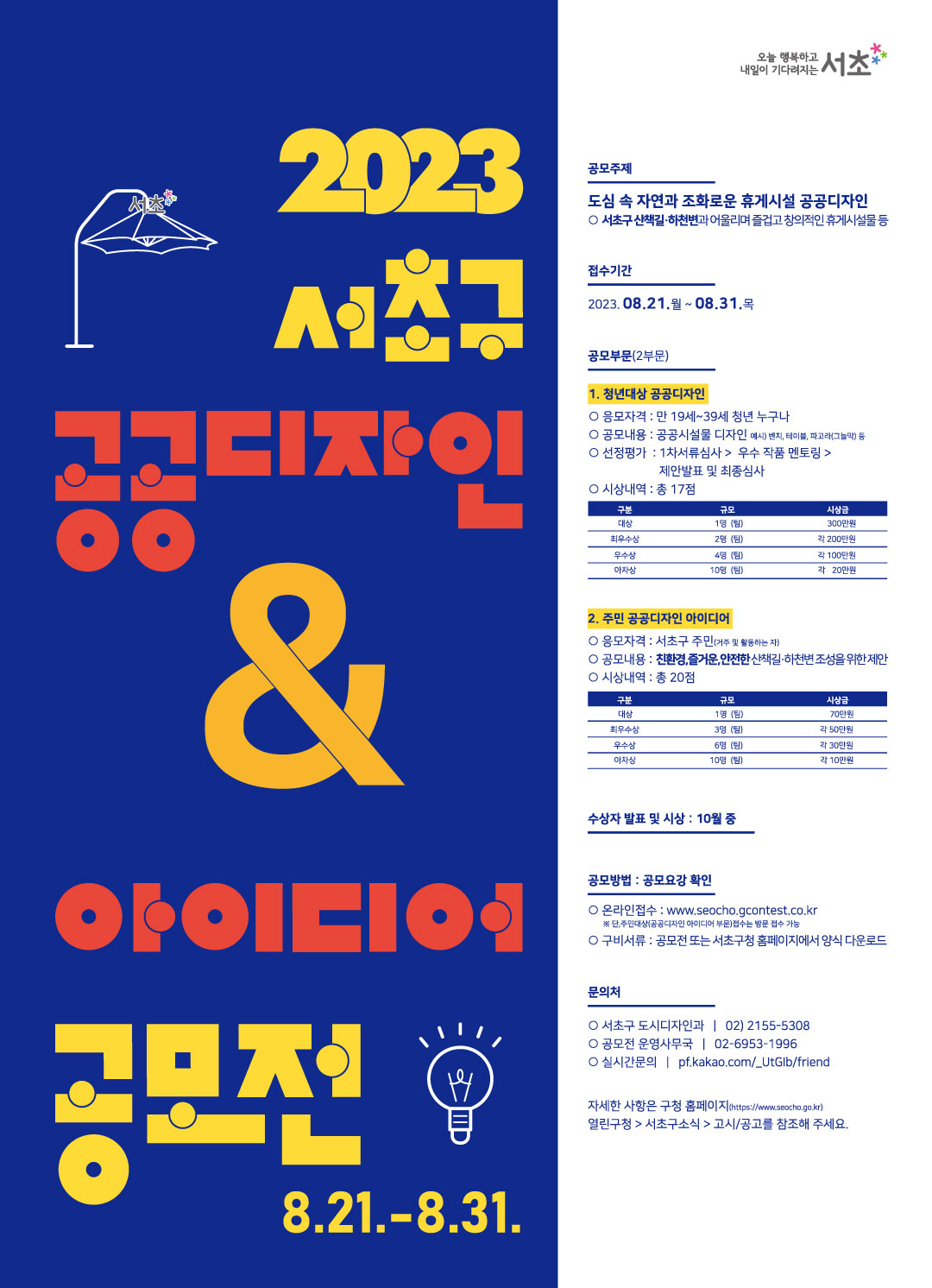 ◈ 문의사항 - 온라인 접수 : www.seocho.gcontest.co.kr - 실시간문의 : pf.kakao.com/_UtGIb/friend - 전화문의 : 02-6953-1996