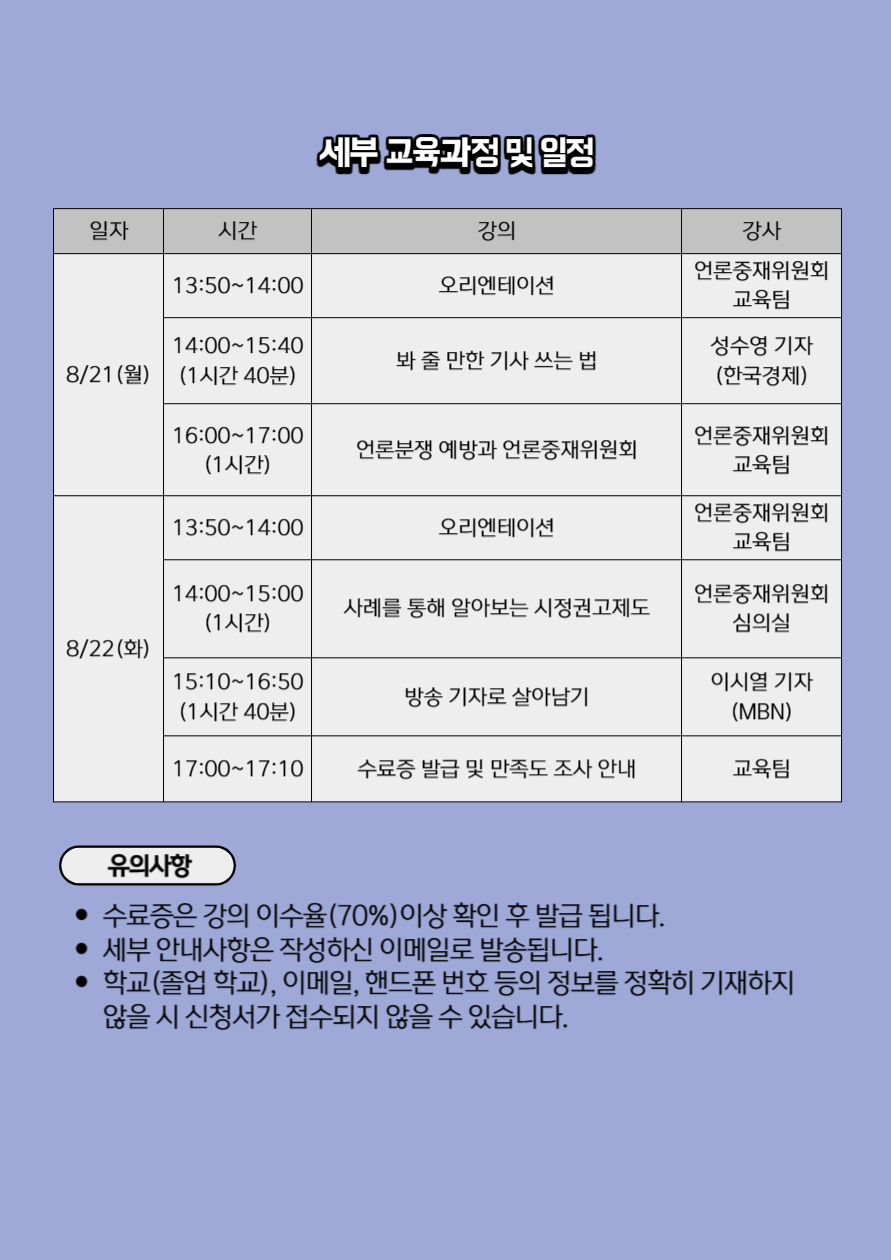 자세한 일정은 첨부의 일정표를 확인해주세요. 기자를 지망하는 학생분들의 많은 관심 부탁드립니다.