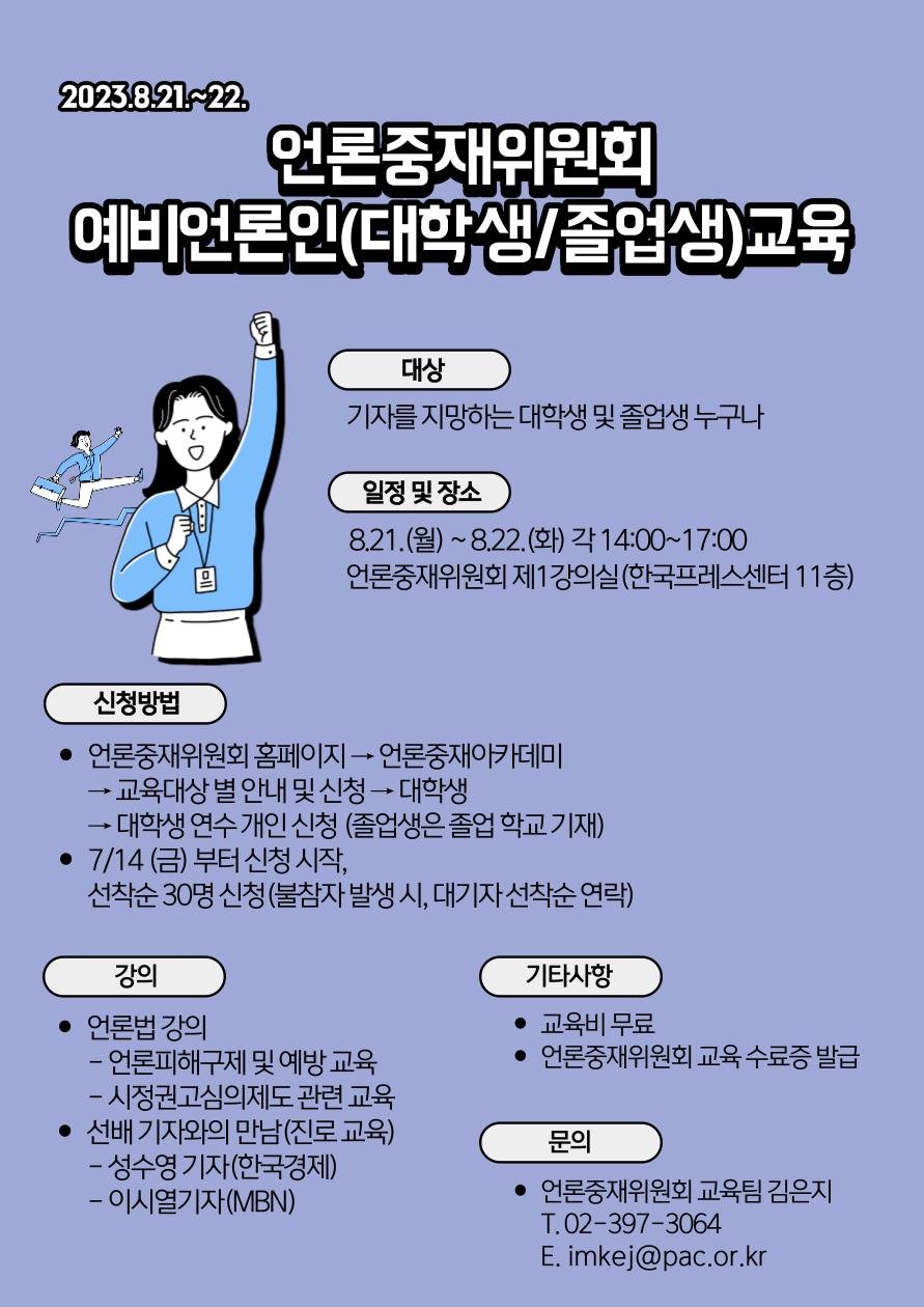 안녕하세요. 언론중재위원회 교육팀입니다. 2023년도 제1차 예비언론인(대학생, 졸업생) 교육 연수를 실시합니다. 기자를 지망하는 대학생 및 졸업생은 누구나 신청 가능한 대면 교육이며, 수강인원 30명을 선착순 모집합니다. (14일 자정 신청 오픈) 교육비는 무료이고, 교육 완료 시 이수증이 발급됩니다. 언론피해구제 관련 교육을 포함하여, 현직 신문기자/방송기자 선배들과 직접 만나는 시간도 마련되어 있습니다.