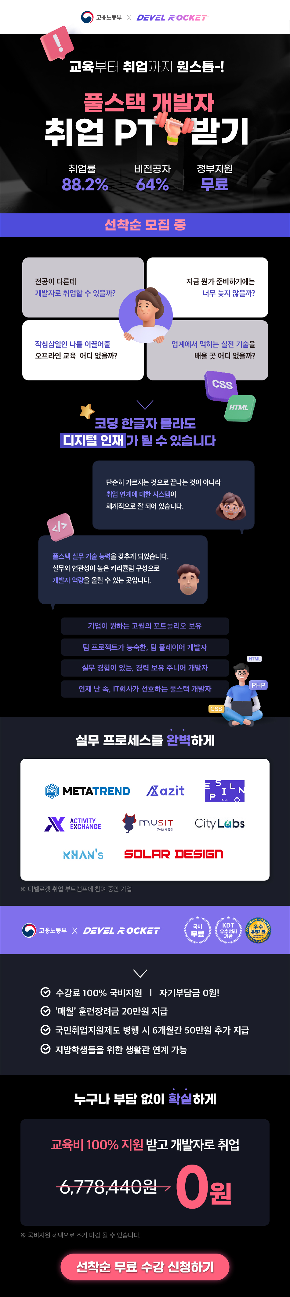 [풀스택-웹] 국비지원 풀스택 개발자 양성 과정 챗GPT활용 ○ 모집개요 - 전액 국비지원\, 취업부트캠프 풀스택 웹 개발자 양성과정의 참여자를 모집하오니 많은 관심과 참여 부탁드립니다. Java, Spring, Python, Chat GPT를 활용한 프로젝트로 전문성을 갖춘 풀스택 개발자 성장할 수 있습니다. 풀스택 개발자 양성 과정 2,500명 이상의 수료생으로 검증했습니다. 수료 후 평균 취업기간 1개월 이내, 디벨로켓에 탑승하세요! ○ 교육기간 -2023. 08. 02 - 2023.12.28 ○ 지원자격 - 고등학교 졸업자 - 대학교 재학생 - 대학교 졸업생 - 대학교 졸업예정(졸업유예)도 가능 - 취업 준비생 - 비전공자 환영 ○ 모집인원 - 20명 ○ 활동내용 -풀스택 웹 개발자 취업 부트캠프 ○ 접수방법 - 홈페이지 접수 (바로가기) ○ 혜택내역 - 수강료 전액 정부지원으로 일체 자기부담금이 없습니다. - PC\, 교재 등 모두 준비되어 있습니다. 몸만 오시면 됩니다. - 수업만 들어도 매달 200\,000원 장려금을 받을 수 있습니다. - 국.취.제 신청시 최대500\,000원씩 6개월간 추가 지원받을 수 있습니다. - 수료후에도 취업에 필요한 공고매칭\,이력서\,자소서\,포트폴리오 등의 모든 구직활동을 무료로 지원해드립니다. ○ 문의 - ☏ 02-479-4050(내선번호 1\~2번) - 카카오톡으로 문의하기 (바로가기)