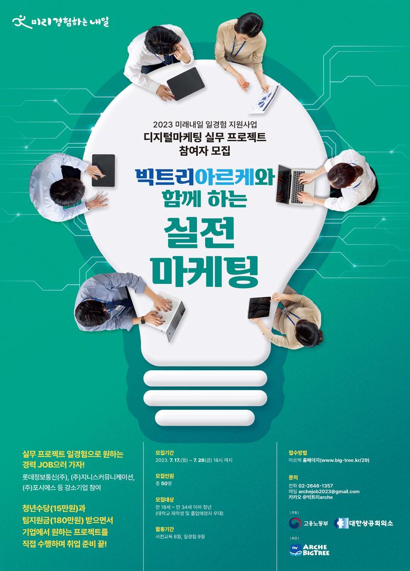 청년수당(15만원)과 팀별수당(180만원) 받으면서 기업프로젝트 수행하고 싶은 청년, 여기 모여라!✋ 고용노동부 대한상공회의소 주최로 실시하는 “2023 미래내일 일경험 사업“ 빅트리 아르케가 "디지털마케팅 실무 프로젝트 2차” 참여자를 모집합니다! ★디지털마케팅 실무 프로젝트★ 디지털마케팅 업무를 수행하기 위한 사전교육을 받고 습득된 역량을 실무 프로젝트를 통해 확인해 볼 수 있는 취업역량 강화 프로그램으로 이를 바탕으로 성공적인 취업 준비 완성! ✔교육비 전액 무료 ✔기업 현직자 멘토링 ✔실무 프로젝트 경험 ✔청년수당(개인별 15만원) + 팀지원금(180만원) 지급 ● 모집기간 : 07.17(월) \~ 07.28(금) ● 모집대상 : 만 18세 이상 \~ 만 34세 이하의 청년 미취업자 ● 모집인원 : 50명 ● 활동기간 : 사전교육 8월, 일경험 9월 ● 활동장소 : 올댓마인드 신논현점(서초구 반포동737) ● 활동내용 - 기술역량(기획실무, 비주얼디자인, 영상편집 등)&직무역량(마케팅 커뮤니케이션, 프레젠테이션 실무 등) 강의 진행 - 직업진로 교육 (기업현직자 멘토링) - 디지털마케팅 실전 프로젝트 - 온라인 강의 제공 ● 신청서 제출 https://big-tree.kr/29 ● 문의처 전화 02-2646-1357 \| 메일 archejob2023@gmail.com \| 카카오 @빅트리arche 주최 \| 고용노동부, 대한상공회의소 운영 \| ㈜아르케 아르케 블로그 : https://blog.naver.com/bigtreearche 아르케 홈페이지 : www.big-tree.kr