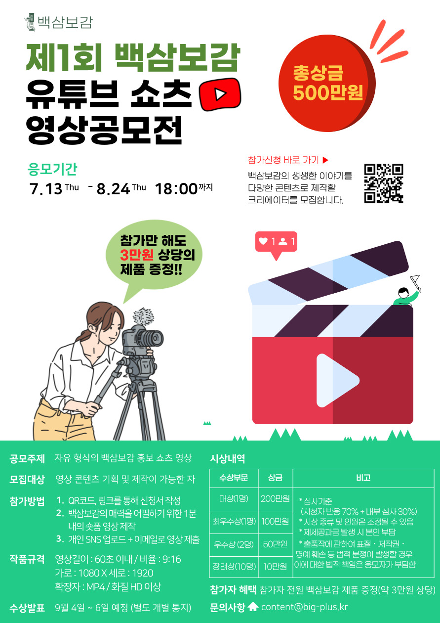 ■ 작품 규격 〇 영상 길이 : 60초 이내 / 비율 : 9:16 ※ 수상작은 홍보 목적으로 활용하기 위해 원본 파일 제출 필수 〇 가로 1080 X 세로 1920 〇 확장자 : avi, MOV, MP4 / 화질 HD 이상 ■ 참가방법 1. 포스터 QR코드\, 구글 폼 설문지 URL을 통해 참가 신청서 제출 (https://docs.google.com/forms/d/e/1FAIpQLSc2_iMz-LM61e6foTz1Ayq7Uie5HWyH-20s1WwnNEZTI0zTTA/viewform) 2. 60초 이내의 숏폼 영상 제작 후 전자우편 (content@big-plus.kr) 제출 + 개인 SNS채널에 영상 업로드 ※ 이메일로 업로드된 SNS URL과 영상 원본 파일 제출 ※ 파일명 : 백삼보감 숏츠_(이름) / ex) 백삼보감 숏츠_홍길동 ※ 참가 신청서를 작성하지 않은 경우 심사에서 제외 ※ 개인 SNS채널에 영상 업로드는 필수이지만 채널의 크기는 심사에 반영되지 않습니다.