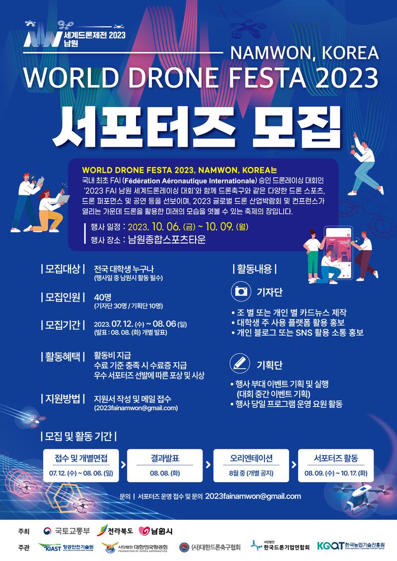 행 사 명 : 세계드론제전 2023, 남원 행사 일정 : 2023. 10. 06. (금) \~ 10. 09. (월) 행사 장소 : 남원종합스포츠타운