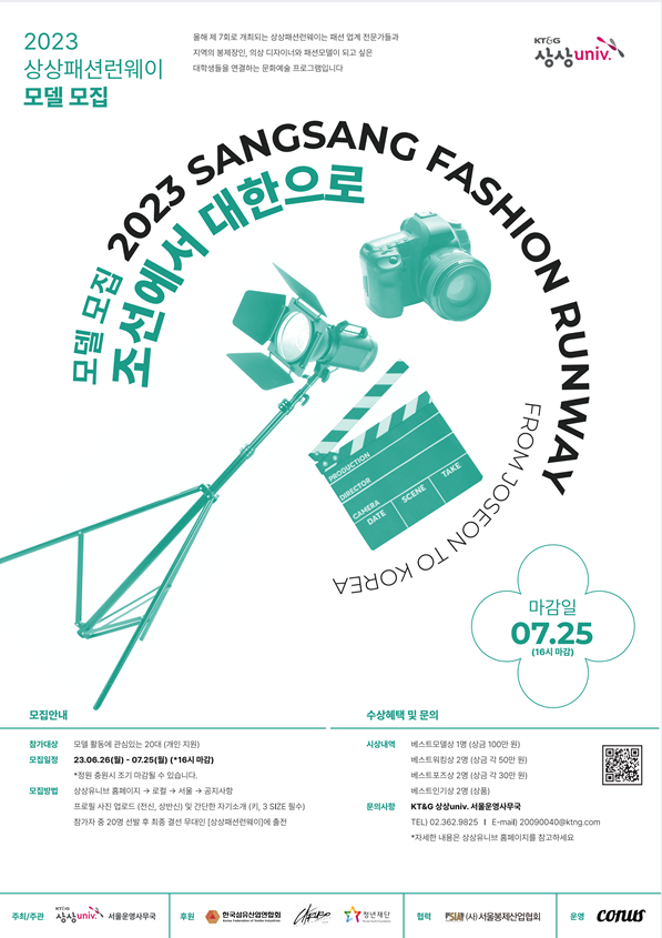 📢 "상상패션런웨이"란? 올해로 7회차를 맞이하는 상상패션런웨이는 청년의 문화적 성장과 지역 활성화 지원을 통한 사회적 가치 창출을 위해, '의상 디자이너를 꿈꾸는 전국 대학생들과 패션 모델을 지망하는 20대 청년들'에게 패션업계 전문가의 실무 교육 및 인큐베이팅의 장을 마련하여 대한민국의 미래인 청년층을 지원하는 프로그램입니다.