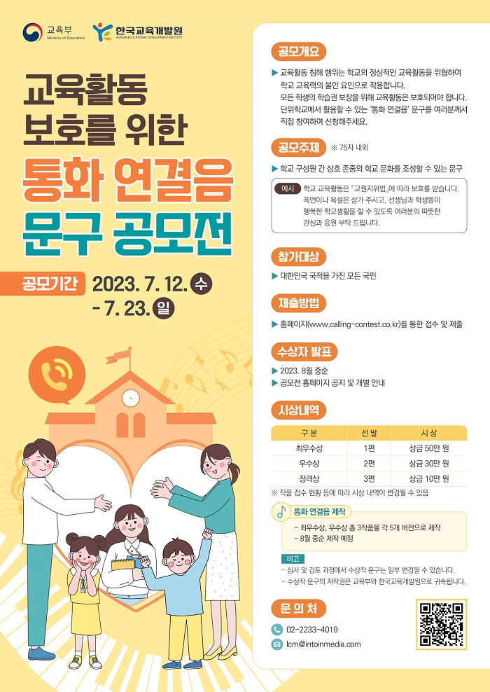 ■ 응모개요 - 교육활동 침해 행위는 학교의 정상적인 교육활동을 위협하여 학교 교육력의 불안 요인으로 작용합니다. - 모든 학생의 학습권 보장을 위해 교육활동은 보호되어야 합니다. - 단위 학교에서 활용할 수 있는 '통화 연결음' 문구를 여러분께서 직접 참여하여 신청해주세요. ■ 응모주제 - 학교 구성원 간 상호 존중의 학교 문화를 조성할 수 있는 문구 예시) 학교 교육활동은 「교원지위법」에 따라 보호를 받습니다. 폭언이나 욕설은 삼가 주시고, 선생님과 학생들이 행복한 학교생활을 할 수 있도록 여러분의 따뜻한 관심과 응원 부탁 드립니다. ※ 75자 내외 ■ 응모자격 - 대한민국 국적을 가진 모든 국민 ■ 응모일정 - 접수기간 : 2023. 07. 12. \~ 2023. 08. 23 - 수상자 발표 : 2023. 8월 중순 *공모전 홈페이지 공지 및 개별 안내 ■ 접수방법 - 홈페이지(www.calling-contest.co.kr)를 통한 접수 및 제출 ■ 시상내역 - 최우수상(1편) 상금 50만원 - 우수상(2편) 상금 각 30만원 - 장려상(3편) 상금 각 10만원 ■ 기타 - 통화 연결음 제작 : 최우수상\, 우수상 총 3작품을 각 5개 버전으로 제작 (8월 중순 제작 예정) ■ 유의사항 - 심사 및 검토 과정에서 수상작 문구는 일부 변경될 수 있습니다. - 수상작 문구의 저작권은 교육부와 한국교육개발원으로 귀속됩니다. ■ 문의 - 02-2233-4019 - lcm@intoinmedia.com