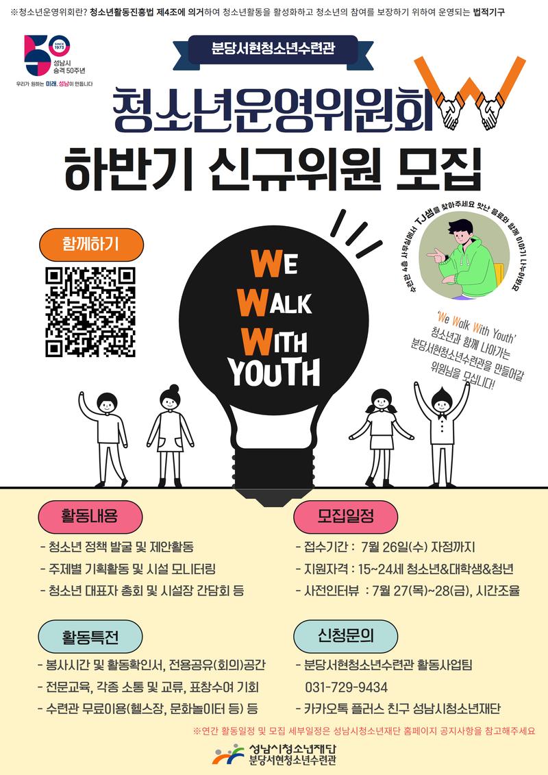청소년운영위원회W 하반기 신규위원 모집 *청소년운영위원회란? 청소년활동진흥법 제4조에 의거하여 청소년활동을 활성화하고 청소년의 참여를 보장하기 위하여 운영되는 법적기구 ‘We Walk With Youth’ 청소년과 함께 나아가는 분당서현청소년수련관을 만들어나갈 청소년운영위원회W에서는 청소년수련관 운영 및 각종 프로그램 등의 자문평가에 직접 참여하고, 각종 기횔활동 추진을 통해 청소년수련시설로서 원활한 역할 수행과 청소년 참여의식 확대를 도모합니다. ○ 지원자격 - 성남시 거주, 재학, 활동 등 15 \~ 24세 청소년 ○ 지원기간 - 7월 26일(수) 자정까지 ○ 신청방법 - 온라인 접수(https://forms.gle/npNsb9vAJTgPS4V88) ○ 선발인터뷰 - 7월 27일(목)\~28일(금), 이틀 중 시간협의, 분당서현청소년수련관 2층 청소년운영위원회실(참여터) ○ 합격자발표 - 인터뷰 후 개별연락 ○ 활동내용 - 청소년 정책 발굴 및 제안활동, 주제별 기획활동 및 시설 모니터링, 청소년대표자 총회 및 시설장 간담회 등 ○ 활동혜택 - 봉사시간 및 활동확인서 발급, 전용공유(회의)공간 제공, 전문교육, 각종 소통 및 교류, 표창수여 기회 제공, 수련관 무료이용(헬스장, 문화놀이터 등) ○ 문의 - 031)729-9434 *자세한 내용은 첨부파일 참조