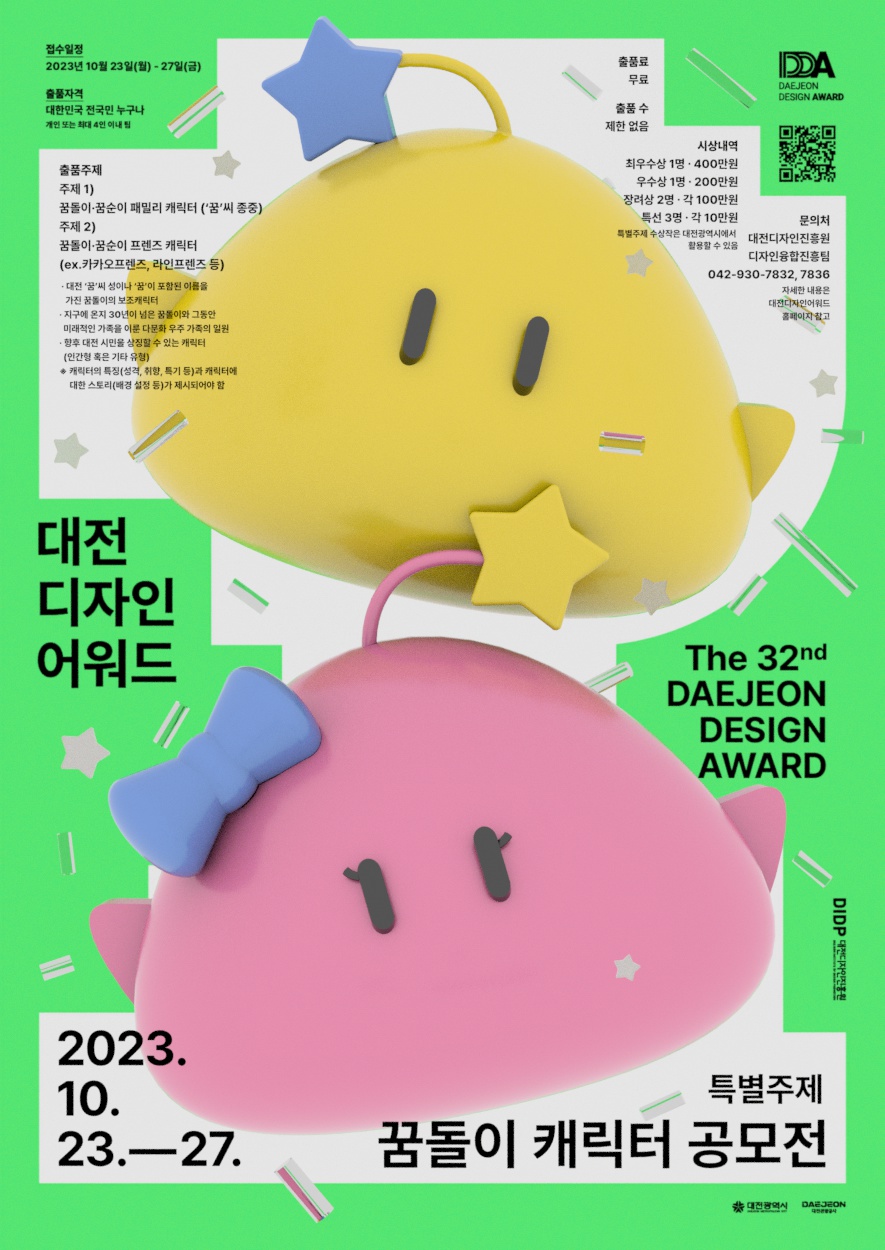 대전디자인진흥원에서는 대전 엑스포 30주년을 맞이하여, 대전의 무형자산인 대전 엑스포 공식 마스코트 ‘꿈돌이’의 캐릭터 공모전을 통해 대전의 성공적인 도시 브랜딩의 발판 마련을 위해 ‘꿈돌이 캐릭터 공모전’을 제32회 대전디자인어워드와 연계하여 특별주제로써 개최합니다. 대한민국 국민 여러분의 많은 관심과 참여를 부탁드립니다.