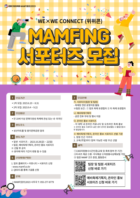 5. 신청방법(택일) 1. MAMF 홈페이지 신청 : MAMF홈페이지 > 커뮤니티 > 서포터즈 신청 www.mamf.co.kr 2. 구글폼 신청 https://forms.gle/UGNDYaULNpkfhp4HA (팀장 및 팀원) https://forms.gle/ov74nQha5zfAB7kh9 (예비축제기획자, 온라인 홍보 서포터즈)