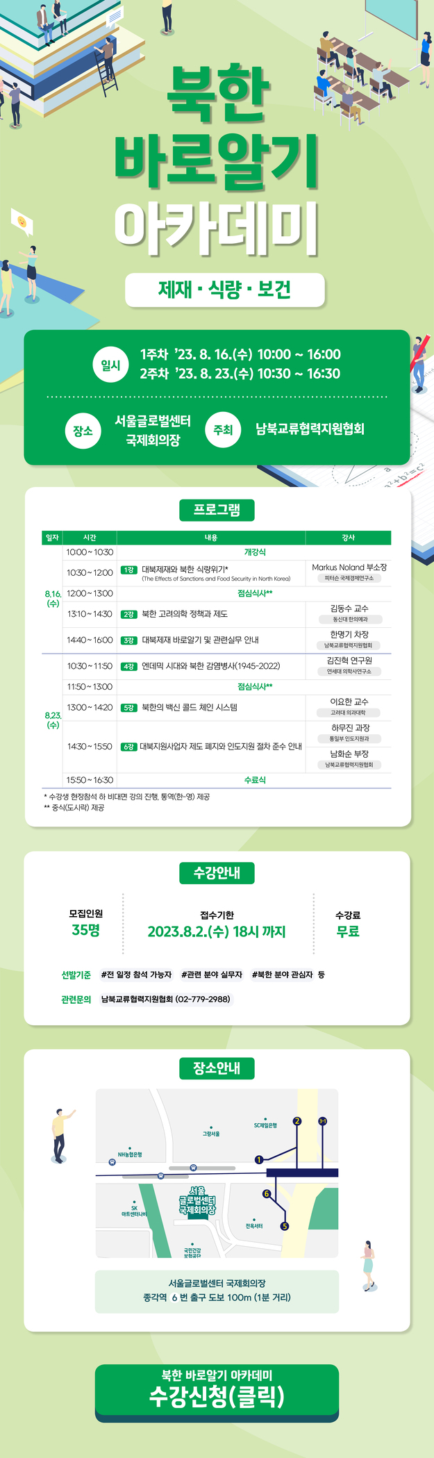 남북교류협력지원협회에서 오는 8월 16일(수), 8월 23일(수) (2일간) 북한 바로알기 아카데미를 개최하오니 여러분들의 많은 관심과 참여 부탁드립니다.