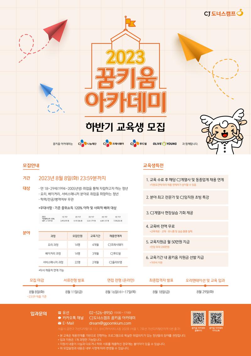 제목 : [CJ나눔재단,CJ계열사 채용연계] 2023 하반기 꿈키움 아카데미 교육생 모집(\~8.8) *본 교육과정은 CJ나눔재단에서 운영하는 청년들을 위한 사회공헌 프로그램입니다. CJ계열사 채용과 별개로 운영되는 프로그램이며, 전체 교육 수료 후 소정의 평가에 의해 CJ계열사로 채용 연계가 가능합니다.
