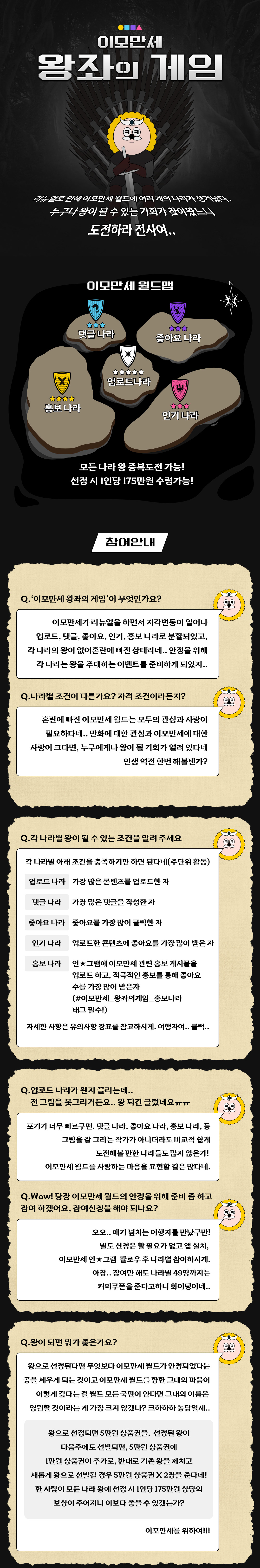 자세한 내용은 게시물 내용을 확인 부탁드리며, 그 외 궁금하신 사항이나 App 내 오류 사항이 있으시다면 저희 이모만세로 DM을 보내주세요📫 이모만세_왕좌의게임 이벤트에 많은 참여와 관심 부탁드려요\~!!(⊙o⊙) " 자네 왕이 될 상인뒈? "