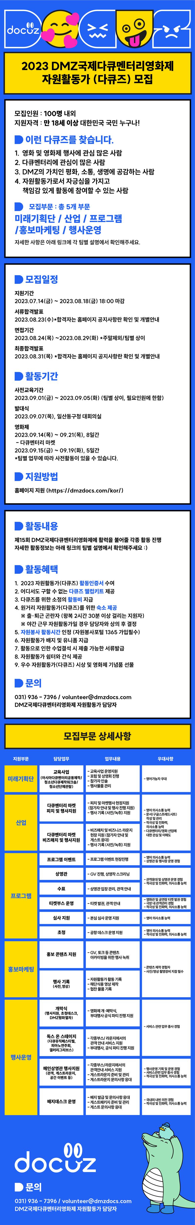 제15회 DMZ국제다큐멘터리영화제 자원활동가 다큐즈 모집 (\~8/18) ■ 지원자격 만 18세 이상 대한민국 국민 누구나 - 평화, 소통, 생명을 중요시하며 다큐멘터리 영화 및 영화제 행사에 관심이 있는 개인/단체 - 자원활동가 선발 및 교육 일정에 성실하고 적극적으로 참여가능한 개인/단체 - 해외동포 및 대한민국 거주 외국인 (단, 한국어로 의사소통이 가능한 경우) 자원활동가 행사일정 및 교육 등의 일정에 성실하고 적극적으로 참여가 가능한 사람 DMZ국제다큐멘터리영화제의 취지에 맞게 관객들을 존중하며 소통 할 수 있는 사람 ※ 이런 다큐즈를 찾습니다 ※ 1. 영화 및 영화제 행사에 관심 많은 사람 2. 다큐멘터리에 관심이 많은 사람 3. DMZ의 가치인 평화, 소통, 생명에 공감하는 사람 4. 자원활동가로써 자긍심을 가지고 책임감 있게 활동에 참여 할 수 있는 사람 ■ 모집부문 : 총 5개 부문 미래기획단/ 산업/ 프로그램/ 홍보마케팅/ 행사운영 자세한 모집안내는 홈페이지 참고 (https://dmzdocs.com/kor/) ■ 모집일정 · 지원기간 : 2023.07.14.(금) \~ 2023.08.18.(금) 18:00 마감 · 서류합격발표 : 2023.08.23.(수) *합격자는 홈페이지 공지사항란 확인 및 개별안내 · 면접기간 : 2023.08.24.(목) \~ 2023.08.29.(화), 주말제외 4일간 · 최종합격발표 : 2023.08.31.(목) *합격자는 홈페이지 공지사항란 확인 및 개별안내 ■ 활동기간 1. 사전교육기간 : 2023.09.01.(금) \~ 2023.09.05.(화) (팀별 상이, 필요인원에 한함) 2. 발 대 식 : 2023.09.07.(목) / 일산동구청 대회의실 3. 활동기간 - 영화제 : 2023.09.14.(목) \~ 09.21.(목) 8일간 - 다큐멘터리 마켓 : 2023.09.15.(금) \~ 09.19.(화) 5일간 ※팀별 업무에 따라 사전활동이 있을 수 있습니다. ※위 기간 중 최소 4일 이상 활동 가능한 자 ■ 지원방법 : 홈페이지 지원 * 홈페이지 주소 : https://dmzdocs.com/kor/ ■ 활동혜택 1. 2023 자원활동가(다큐즈) 활동인증서 수여 2. 어디서도 구할 수 없는 다큐즈 웰컴키트 제공 3. 다큐즈를 위한 소정의 활동비 지급 4. 원거리 자원활동가(다큐즈)를 위한 숙소 제공 ※ 출·퇴근 곤란자 (왕복 2시간 30분 이상 걸리는 지원자) ※ 야간 근무 자원활동가일 경우 담당자와 상의 후 결정 5. 자원봉사 활동시간 인정 (자원봉사포털 1365 가입필수) 6. 자원활동가 배지 및 유니폼 지급 7. 활동으로 인한 수업결석 시 제출 가능한 서류발급 8. 자원활동가 쉼터와 간식 제공 9. 우수 자원활동가(다큐즈) 시상 및 영화제 기념품 선물 ■ 문 의 DMZ국제다큐멘터리영화제 자원활동가 담당자 031) 936-7396 / volunteer@dmzdocs.com