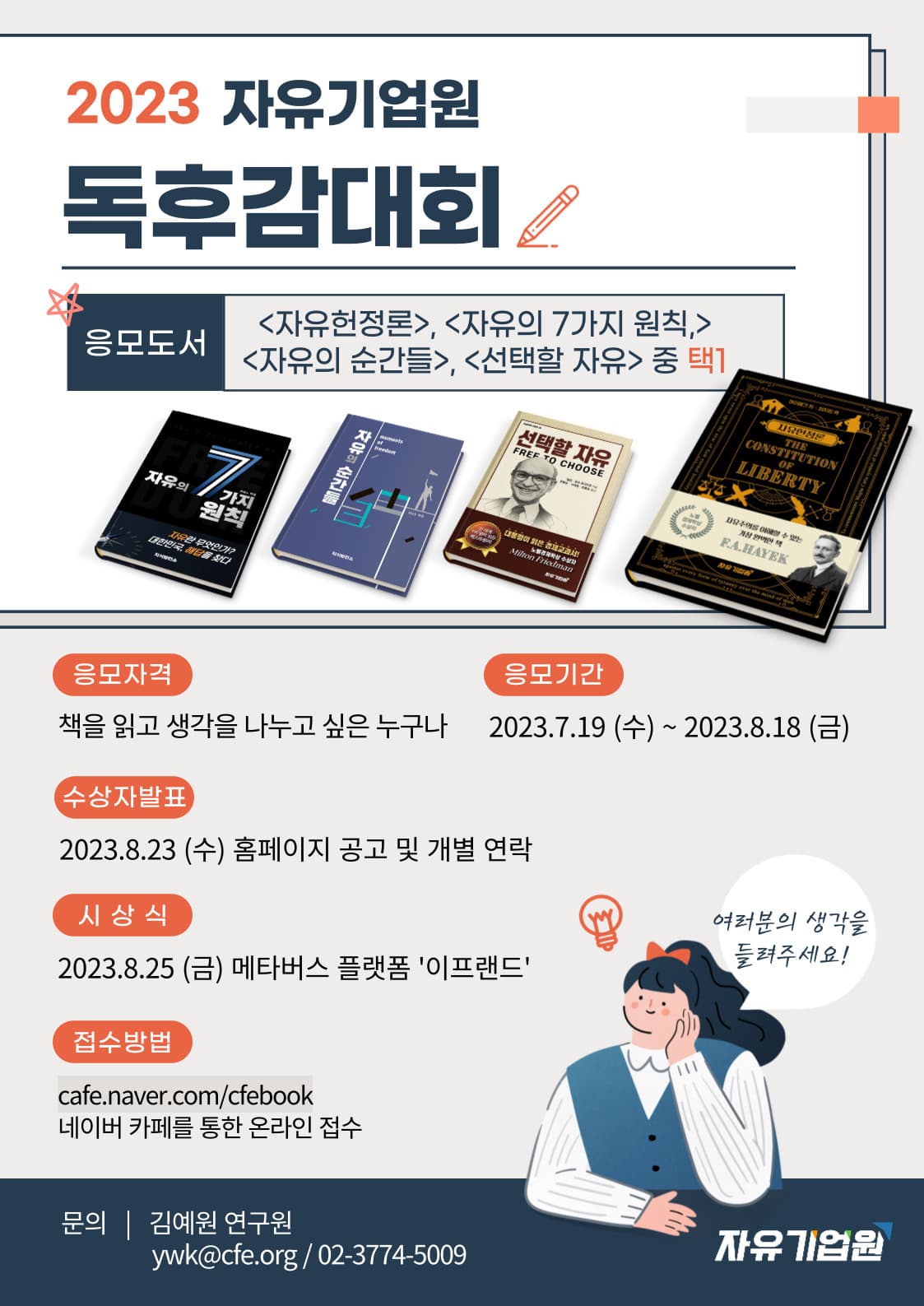 □ 응모방법 : 1. 책을 읽고 독후감 작성하기(띄어쓰기 포함 2\,000자 내외) 2. <자유로운 독서생활> 카페 가입 후 [자유기업원 독후감대회] 게시판에 독후감을 업로드하면 끝! ▶ 카페 바로가기: cafe.naver.com/cfebook ▶ 이름 / 소속 / 연락처를 반드시 기재해주세요. ▶ “스탭만 보기” 체크 필수! ▶ 응모양식 및 방법에 따라 작성하지 않은 글은 수상에서 불이익을 받을 수 있습니다.