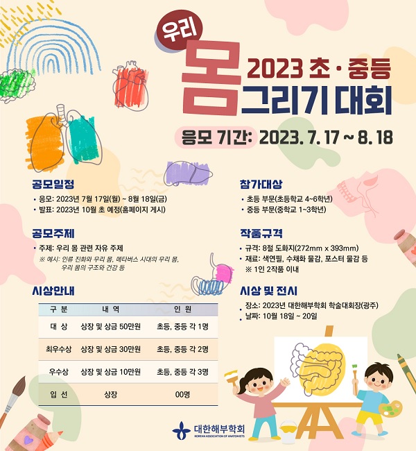 <2023 초·중등 우리몸그리기대회> ◈참가자격 - 초등부문 (초등학교 4-6학년) - 중등부문 (중학교 1-3학년) ◈접수기간 2023년 7월 17일(월) \~ 8월 18일(금) ◈공모 주제 - 우리 몸 관련 자유 주제 ※ 예시: 인류 진화와 우리 몸, 메타버스 시대의 우리 몸, 우리 몸의 구조와 건강 등 ◈공모 내용 - 작품의 소재 : 온몸 , 팔다리와 같은 특정 부위 , 심장과 허파와 같은 장기 , 현미경으로 관찰되는 세포 등 - 우리 몸의 구조(모양)를 과학적 사고와 창의적인 아이디어를 바탕으로 예술적으로 표현한 작품 ◈작품 규격 - 크기: 8절 도화지 (272mm X 393mm) - 재료: 색연필, 수채화 물감, 포스터 물감 등 - 1인 2작품 이내 ◈시상 내용 및 포상 - 대상: 각 부문별 상장, 상금 50만원 (초등. 중등 각 1명) - 최우수상: 각 부문별 상장, 상금 30만원 (초등. 중등 각 2명) - 우수상: 각 부문별 상장, 상금 10만원 (초등. 중등 각 3명) - 입선: 각 부문별 상장 (초등. 중등 각 00명) ※ 수상작은 대한해부학회 학술대회장에서 전시함. ◈지원 방법 2023 초중등 우리몸그리기대회 웹사이트 http://draw.anatomy.re.kr/ ◈선정 결과 발표 - 1차 선정작 발표: 2023년 9월 7일(목) 이후 대한해부학회 홈페이지에서 확인(www.anatomy.re.kr) 및 개별 통보 ※ 1차 선정작은 2023 년 9월 15일(금)까지 액자 없는 실물만을 서류봉투에 담아 우편으로 보낼 것 ※ 우편물 받는 주소: 서울특별시 성북구 고려대로 73, 고려대학교 의과대학 본관 5층 514호 실용해부센터 (02841) ※ 대한해부학회 2023 초 중등 우리 몸 그리기대회 담당자 앞 - 최종 입상작 발표: 2023년 10월 5일(목) 이후 대한해부학회 홈페이지에서 확인(www.anatomy.re.kr) 및 개별 통보 ◈수상작 전시장소 및 전시기간 - 전시장소: 2023년 대한해부학회 학술대회장(김대중컨벤션센터 , 광주광역시 서구 상무누리로 30) - 전시기간: 2023년 10월 18일(수) \~ 10월 20일(금) ※ 작품 접수 상황에 따라 부문 별 분리 전시할 수 있음 ◈주최 대한해부학회 ◈문의 홈페이지 Q&A