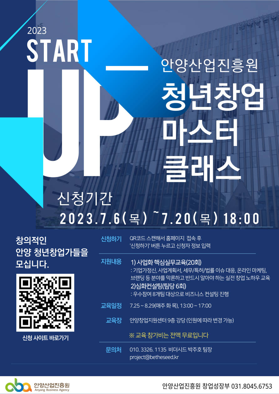 ■ 지원 자격 하기 사항 3개 중 하나라도 해당되면 신청 가능 1) 청년 예비창업자 : 안양시 소재, 만 19세\~39세 예비창업자 2) 청년기업 : 본사 안양시 소재, 대표자가 만 19세\~39세 이거나 임직원의 50% 이상이 만 19세\~39세인 기업 3) 창업기업 : 본사 안양시 소재, 창업 7년 이내 기업