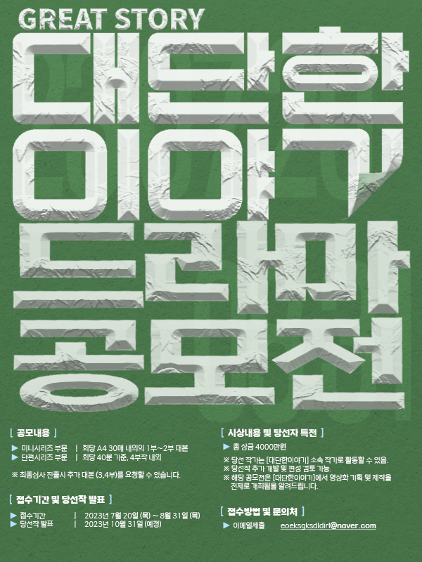 * 해당 공모전은 [대단한이야기]에서 영상화 기획 및 제작을 전제로 개최됨을 알려드립니다.