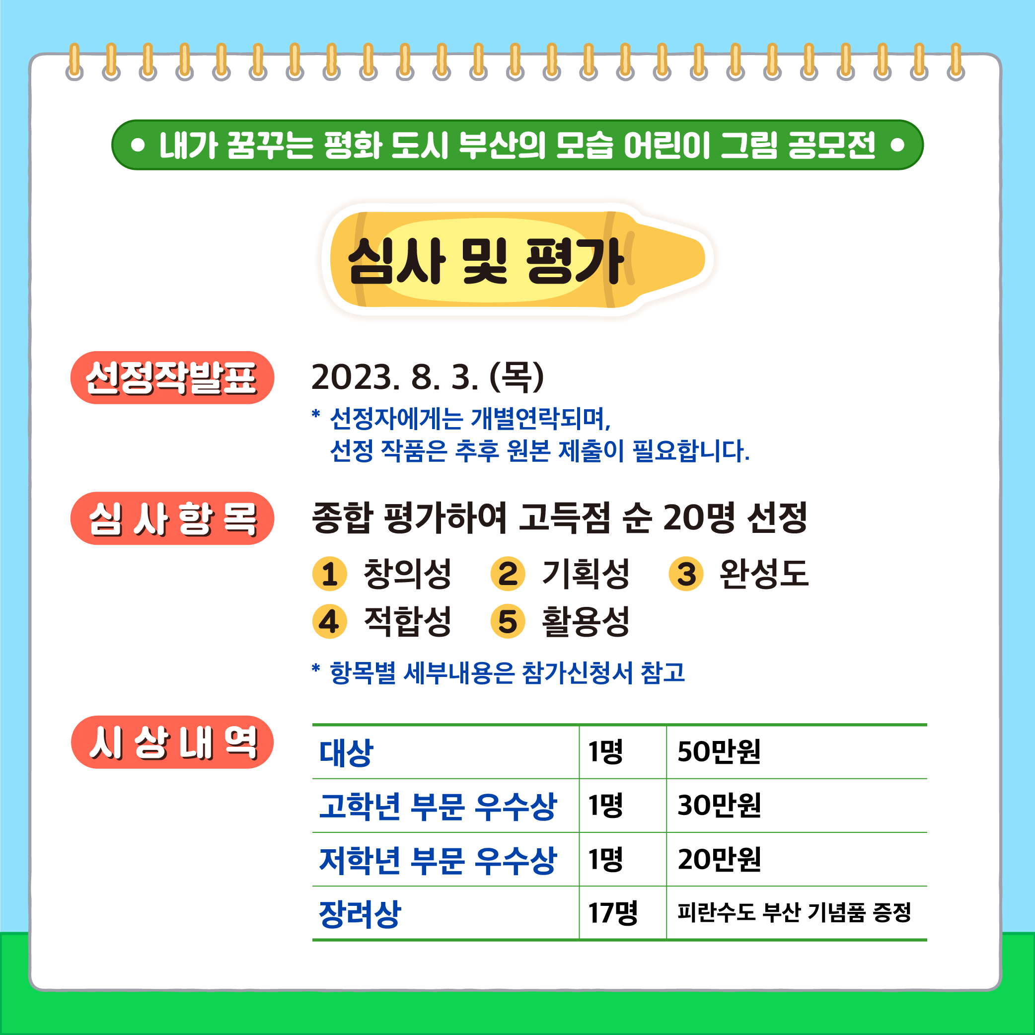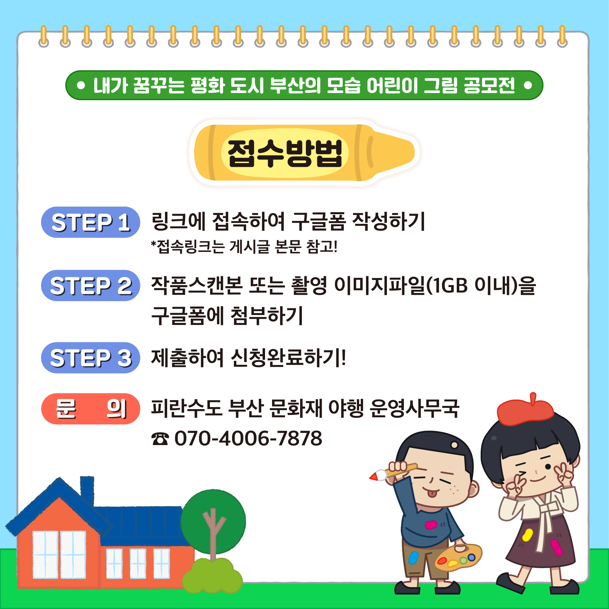 '2023 피란수도 부산 문화재 야행 기획전시'의 어린이 작가를 모집합니다! 우리가 꿈꾸는 평화로운 부산의 모습! 어린이 여러분들의 손으로 직접 그려주세요! 📢 공모전에서 당선된 수상 작품은 피란수도 부산 문화재 야행 기획전시에 전시됩니다!