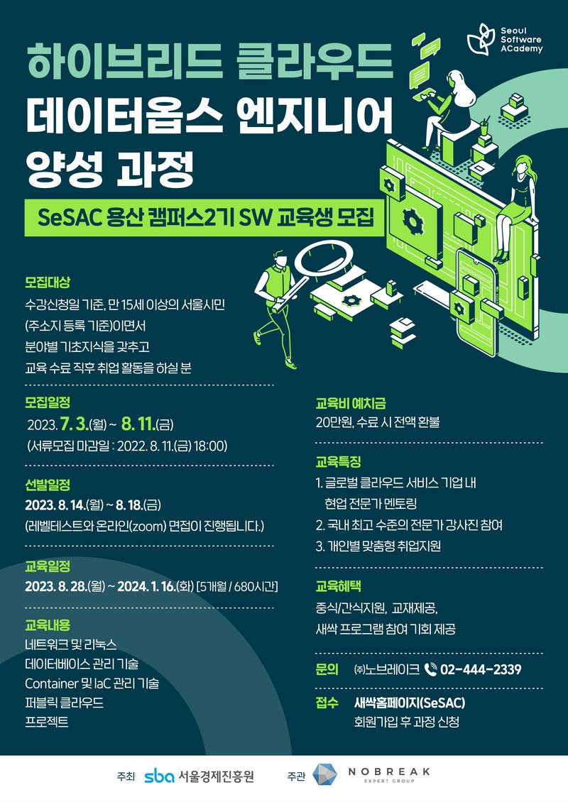 ● 프로그램 내용 - 네트워크와 리눅스, 데이터베이스, 클라우드 서비스 및 IaC에 대한 기초 학습을 토대로 클라우드 SW운영 및 관리를 자동화 할 수 있도록 설계 - MSA 아키텍쳐 및 데이터옵스 등에 대한 데이터 클라우드 운영 관리 수요를 고려한 프로젝트 수행을 통한 실무 능력 배양 - 클라우드 DBaaS 서비스를 활용한 DR 프로젝트 구축 실무 능력 배양 - 프라이빗/하이브리드/퍼블릭/멀티 클라우드등 모든 클라우드 환경에서 요구되는 컨테이너 및 오케스트레이션, IaC 기반 기술 중점 학습 - 데이터 관리 능력을 통한 데이터옵스 구성 및 데이터베이스 백업 및 복구, 데이터베이스 HA/Cluster, 데이터 마이그레이션 (프라이빗/퍼블릭클라우드)기반, 클라우드 DR 설계 및 구축 능력
