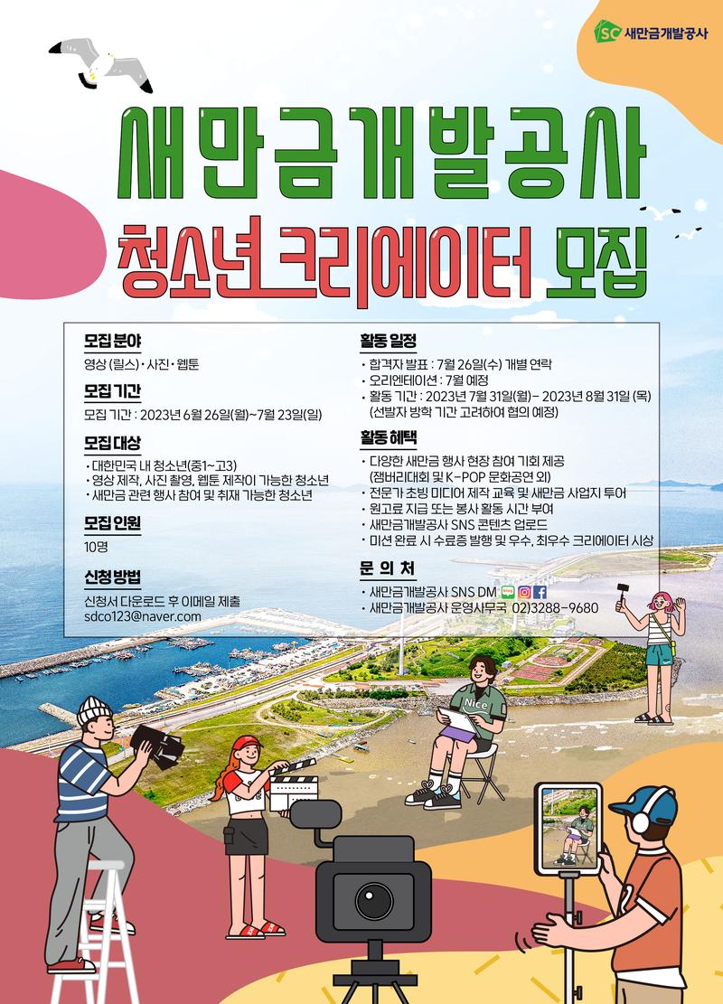 [새만금개발공사] 청소년크리에이터 모집 ○ 모집 분야 - 영상(릴스)·사진·웹툰 ○ 기간 및 일정 - 모집 기간 : 2023년 6월 26일(월) \~ 7월 23일(일) - 합격자 발표 : 7월 26일(수) 개별 연락 - 오리엔테이션 : 7월 예정 - 활동 기간 : 2023년 7월 31일(월) \~ 2023년 8월 31일(목) ○ 모집 대상 - 새만금 지역 내 청소년(중1\~고3) - 새만금 지역 외의 경우 새만금 산업단지 내 근무자 가족을 둔 청소년 - 영상 제작\, 사진 촬영\, 웹툰 제작이 가능한 청소년 - 새만금 관련 행사 참여 및 취재 가능한 청소년 ○ 접수방법 - 신청서 다운로드 후 이메일 제출 - sdco123@naver.com ○ 활동 혜택 - 원고료 지급(문화상품권) 및 다양한 새만금 행사 취재 기회 제공 - 새만금개발공사 SNS 콘텐츠 업로드 - 봉사활동 시간 부여 - 미션 완료시 수료증 발행 및 우수\, 최우수 크리에이터 시상 ※ 합격후에도 포트폴리오가 허위임이 밝혀지거나 실력이 현저히 미달될 경우 신청이 취소될 수 있습니다. ○ 문의 - ☏ 02)3288-9680 - 새만금개발공사 SNS DM(네이버블로그\, 페이스북\, 인스타그램)