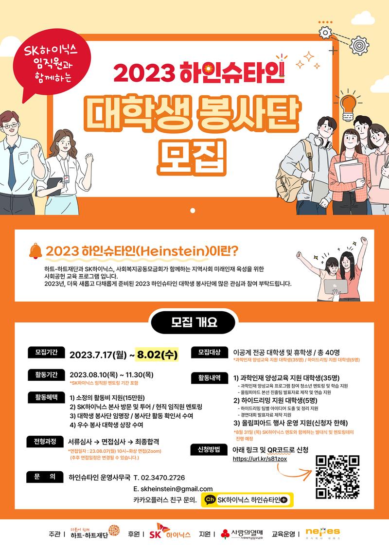 🔔 2023 하인슈타인(Heinstein)이란? 하트-하트재단과 SK하이닉스, 사회복지공동모금회가 함께하는 지역사회 미래인재 육성을 위한 사회공헌 교육 프로그램 입니다. 2023년, 더욱 새롭고 다채롭게 준비된 2023 하인슈타인 대학생 봉사단에 많은 관심과 참여 부탁드립니다.
