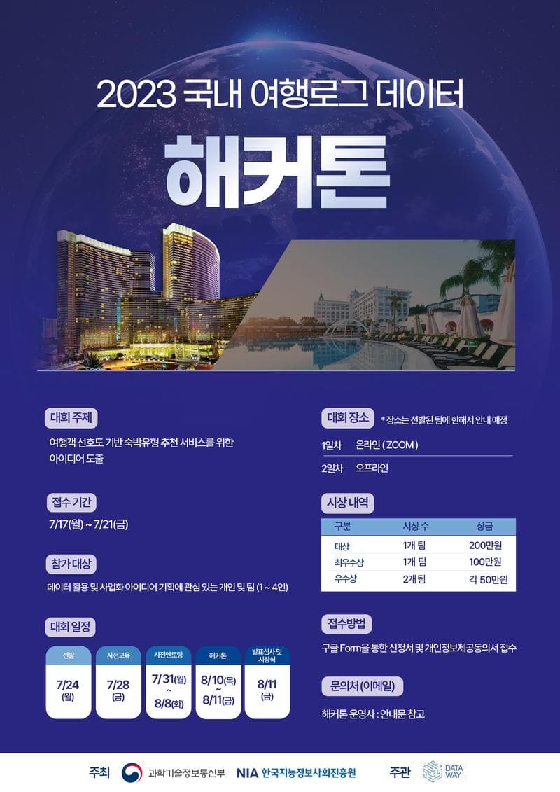 안녕하세요, NIA(한국지능정보사회진흥원)에서 주최하고 (주)데이터웨이에서 주관하는 '2023년 여행로그 데이터 해커톤' 대회 공모를 다음과 같이 안내드리고자 합니다. 아래 내용 및 첨부파일에 있는 공고문을 참고해주시고, 많은 관심과 참여 부탁드립니다. 1. 모집 개요 1) 대회명 : 2023 국내 여행로그 데이터 해커톤 2) 대회일시 : 2023.08.10(목) \~ 08.11(금) 3) 대회장소 : 온/오프라인 병행(안내문 참조) 4) 대회주제 : 여행객 선호도 기반 숙박유형 추천 서비스를 위한 아이디어 도출 5) 모집대상 : 아이디어 기획에 관심 있는 개인 및 팀(일반인, 1\~4인) 2. 신청 및 접수 1) 신청 기간 : 2023.07.17(월) \~ 21(금) 2) 신청 방법 : 구글 폼을 활용한 신청서 접수