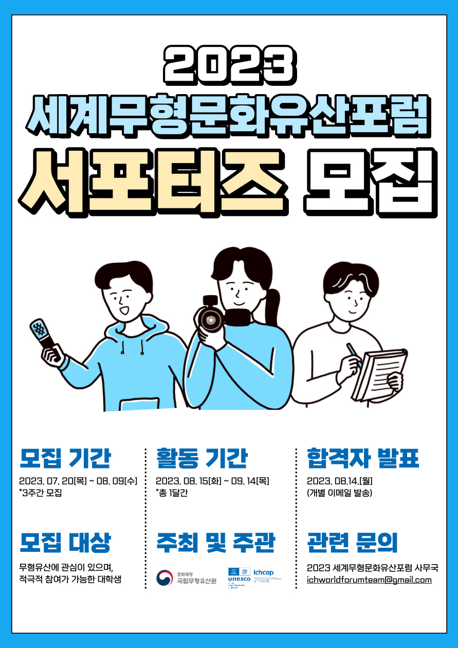 무형문화유산보호협약 20주년을 맞아 국립무형유산원, 유네스코아태무형문화유산센터에서 개최하는 2023 세계무형문화유산포럼에서 열정 넘치는 대학생 서포터즈를 모집합니다🙋🏻♀️