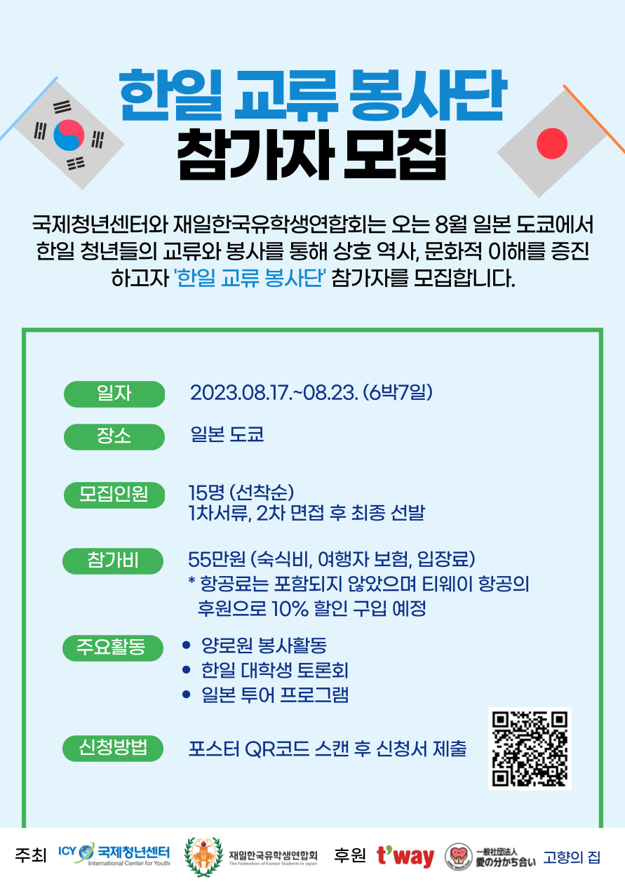 *투어 장소는 재한한국유학생연합회 추천과 함께 참가자와 협의 후 확정 예정 ● 모집 인원 : 15명(선착순) 1차 서류, 2차 면접 후 최종 선발 - 참가 신청을 하시면 운영팀에서 개별적으로 면접 및 오리엔테이션 안내를 드립니다. ● 신청 방법 : https://forms.gle/Hux2X15dXCPC9Pp5A 온라인 신청서 제출 ● 참가비 : 55만원 *참가비에는 숙식비(저녁은 자유시간으로 저녁식사는 제공되지 않음), 여행자보험, 입장료, 교통비 포함 *항공료는 포함되지 않았으며 티웨이 항공의 후원으로 10% 할인 단체 구입 예정 (대략 35만원) * 환불 정책 - 활동일 기준 10일전까지 취소 요청 시 : 전액 환불 가능 - 활동일 기준 3일전까지 취소 요청 시 : 50% 환불 - 활동일 당일 및 노쇼 시 : 변경 및 전액 환불 불가 ● 주최 : 국제청년센터, 재일한국유학생연합회 ● 후원 : 티웨이항공, 사랑의나눔, 고향의집 ● 문의 : https://open.kakao.com/o/soX7JSff 카카오톡 1:1 오픈채팅방 한일대학생교류봉사단은 재일한국유학생연합회와 국제청년센터가 공동 추진하고 있습니다. 1) 재일한국유학생연합회 - 봉사 프로그램 기획 및 운영 - 숙박/식당/탐방지 섭외 및 예약 - 역사탐방 및 문화탐방 기획 및 인솔 - 교통편 (항공권, 전철패스, 버스 대절 등) - 통역 2) 국제청년센터 - 참가자 모집 및 교육 - 참가자 인솔 FAQ 1. 선발 과정은 어떻게 되나요? 온라인 신청서를 제출하시면 운영팀에서 면접에 대한 안내를 해 드릴 것입니다. 면접은 비대면으로 진행되며 오리엔테이션 서울에서 대면을 원칙으로 하나 거주지가 지방으로 오티 장소가 먼 참가자를 위해 온오프라인 병행하여 진행됩니다. 2. 참가비는 언제 납부를 해야 하나요? 면접 후 최종 참가자로 확정되면 참가비 납부에 대한 안내를 운영팀에서 드릴 것입니다. 개인적인 사정에 따라 참가 취소시 100% 환불되지 않을 수 있으며 환불 정책을 참고해 주세요. 3. 봉사증은 어떻게 발급 되나요? 1365봉사증으로 발급되며 활동을 준비하기 위한 회의, 활동 기간동안의 봉사시간 등이 봉사시간으로 부여됩니다. 거주지에서 일본까지 이동하는 시간은 봉사시간 부여가 되지 않으며 봉사시간은 하루 8시간을 최대 부여 시간입니다. 봉사증은 봉사를 마친 후 2주이내에 발급되며 필요한 서류를 제출해야 하며 이에 대해 오리엔테이션 때 안내 될 것입니다. 4. 투어는 어떻게 진행되나요? 투어 장소는 재한한국유학생연합회가 추천한 장소와 참가자의 의견을 고려하여 협의 후 확정 예정입니다. 5. 비행기 가격은 어떻게 책정된 건가요? 비행기값은 티웨이 항공의 후원으로 10% 할인한 가격으로 구입시 비행기표 가격에 따라 가격 변동이 있을 수 있습니다.